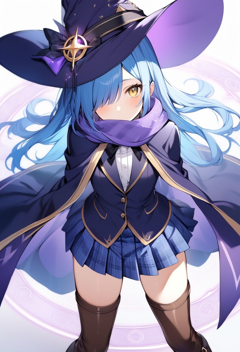 high quality, detailed, 1girl, solo, 15years old, medium brests, long hair, blue hair, yellow eyes, ((sharp eyes)), glowing eyes, hair over one eye, violet scarf over mouth, (violet witch hat, brown thigh boots, cloak), white collared long shirt, pleated skirt, blue plaid skirt, violet blazer, black socks, black ribbon tie, magic circle, dynamic pose, floating, cloud, too many water drops, at night, watercolor, full moon, star light, meteor shower, wide shot, face focus, upper body, ((illusion effect))