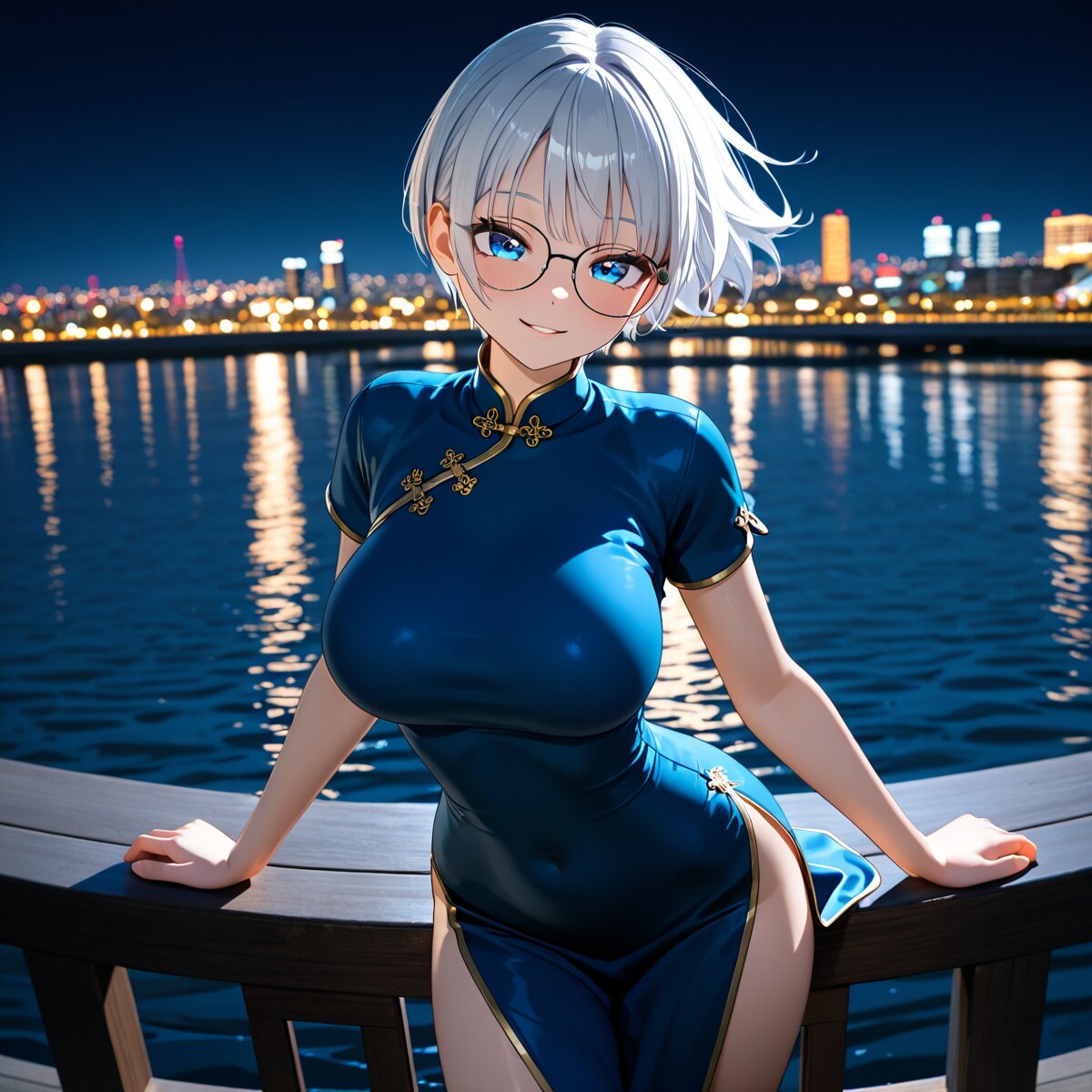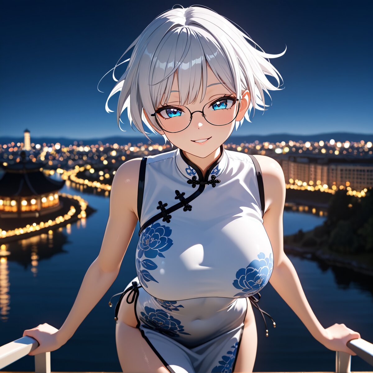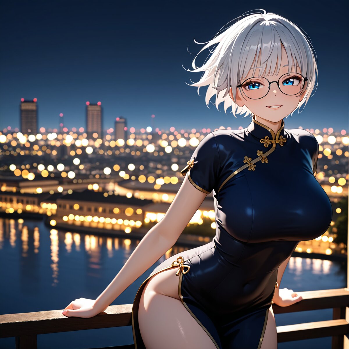 masterpiece, best quality, amazing quality, 4k, very aesthetic, high resolution, ultra-detailed, absurdres, newest, scenery, 3d, rendered, 1girl, solo, glasses, silver hair, very short hair, mild cheerful, seductive smile, choppy bangs, parted lips, big eyes, blue eyes, china dress, large breasts, dynamic, skyline of city lights reflecting on river at night, outdoor, cowboy shot, front view, facing forward, looking straight ahead, soft lighting, floating hair, BREAK, hands, vignetting, dramatic shadow, cinematic lighting, rim light, detailed background, depth of field, vignetting, volumetric lighting