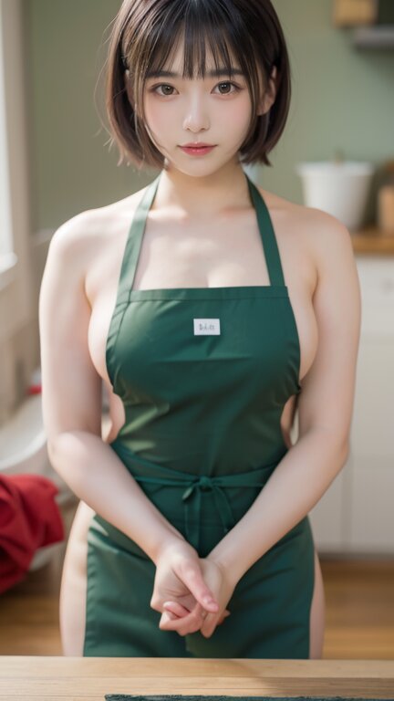 ((masterpiece)), (best quality), Super detailed, fine details, High resolution, 8K,wall paper, perfect dynamic composition,Details High quality, (1girl), putting hands on front, (naked apron, green:1.5), (in the living room), ((short hair with blunt bangs, hime cut)), <lora:00_UmiShinonome_V1:0.7>, <lora:sweetyMixGirl_V2:0.1>, <lora:cutieMixGirl_V1:0.4>, <lora:hime cut_20230820175457:0.2>, <lora:starbucks_apron_v0.2:0.7>