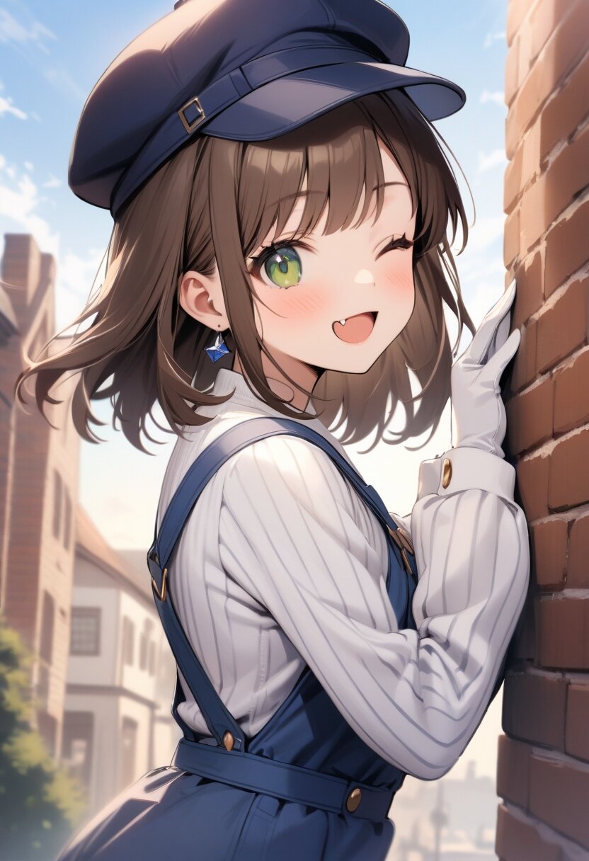detailed, masterpiece, 1girl, solo, 15years old, medium hair, bangs, brown hair, green eyes, earrings, fang, (newsboy hat, dark blue headwear, White Pinstripe sweatshirt, long sleeves, blue overalls, brown loafer, white gloves), one eye closed, smile, open mouth, blush, sky, brick, from side,