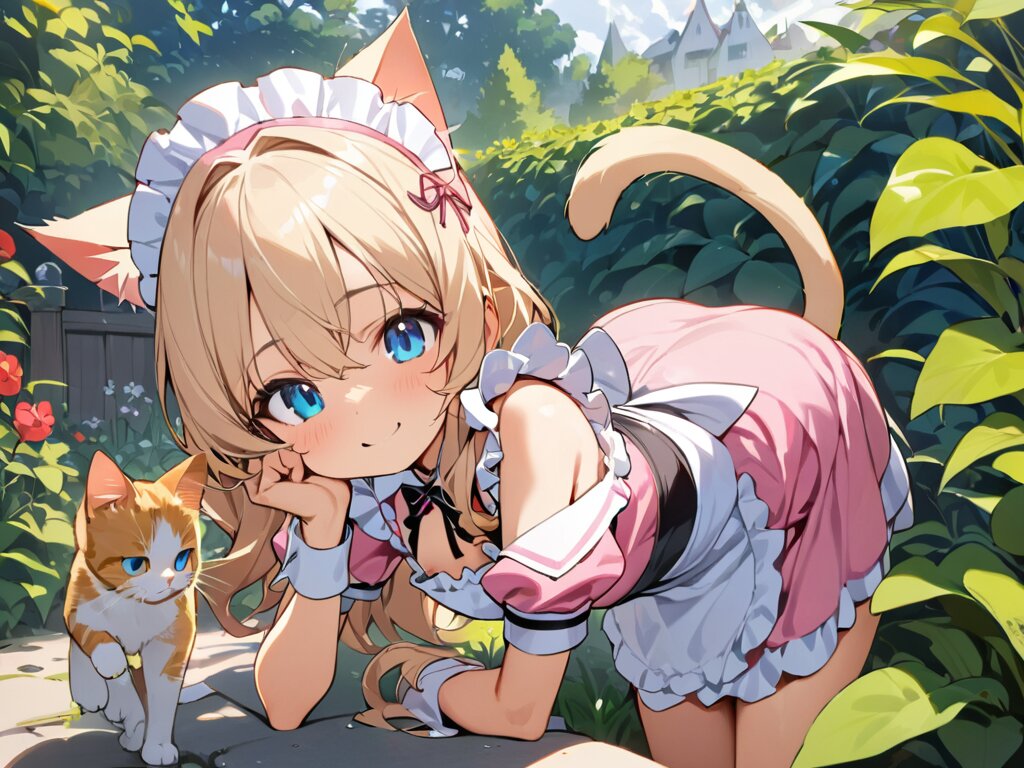 masterpiece, best quality, high resolution, high quality, highres, BREAK, 1 girl , (loli:1.2), little girl, blue eyes, blond hair, long wavy hair, cat ears, white cat tails, BREAK, (open shoulder pink maid uniform:1.4),high waist miniskirt, maid headdress, maid apron, break, neeling, bent over, ( looking at the small cat:1.4), head rest, smile, garden, <lora:Dreamyvibes artstyle SDXL - Trigger with dreamyvibes artstyle:1>