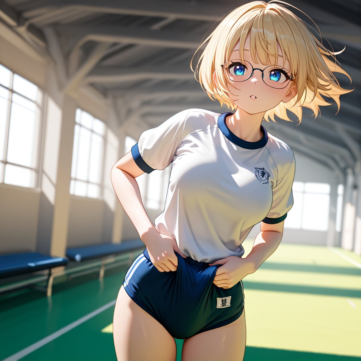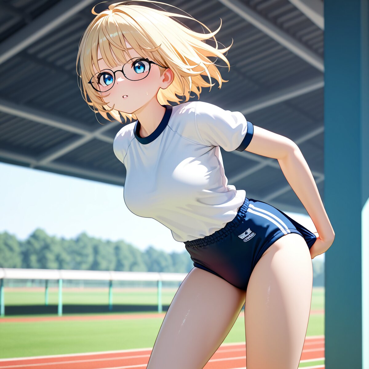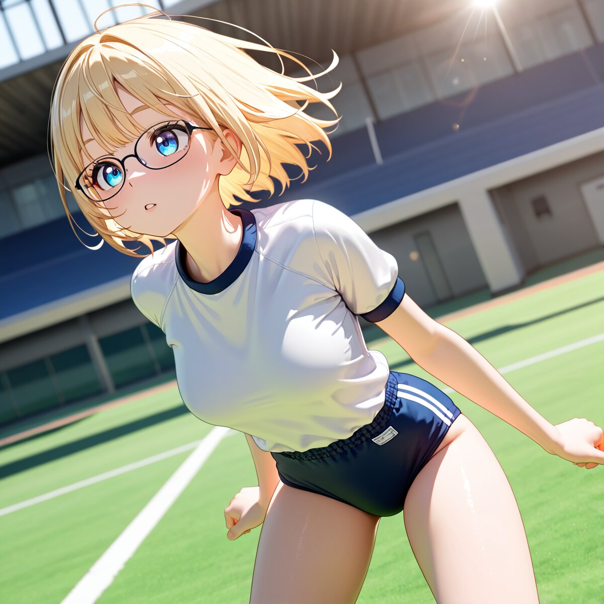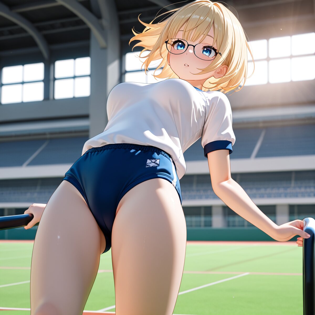 masterpiece, best quality, amazing quality, 4k, very aesthetic, high resolution, ultra-detailed, absurdres, newest, scenery, 3d, rendered, 1girl, solo, glasses, blonde hair, short hair, choppy bangs, parted lips, blue eyes, wedged buruma, buruma with wedgie, bloomers riding up slightly, sports field, medium breasts, dynamic, cowboy shot, front view, facing forward, looking straight ahead, soft lighting, floating hair, BREAK, hands, vignetting, dramatic shadow, cinematic lighting, rim light, detailed background, depth of field, vignetting, volumetric lighting