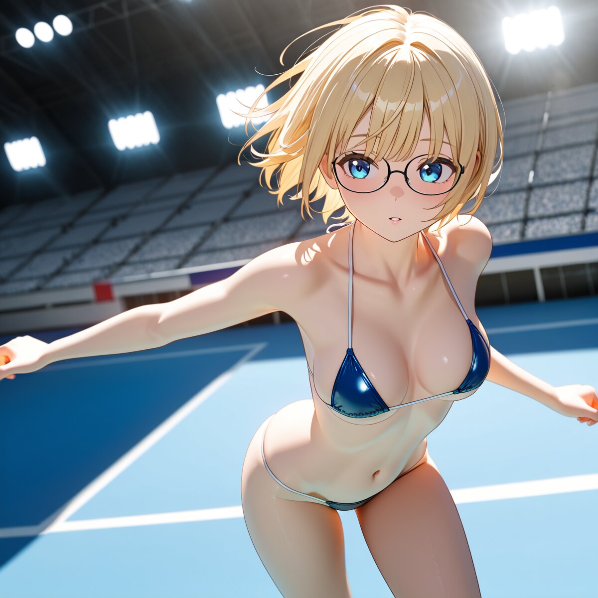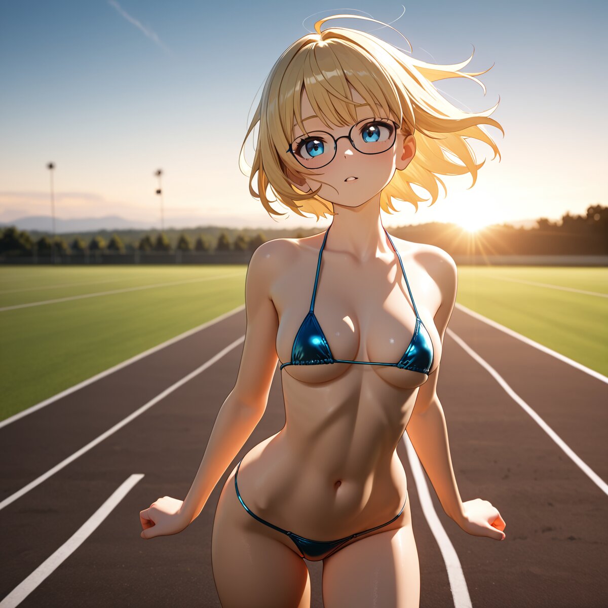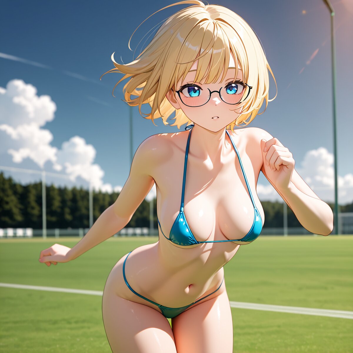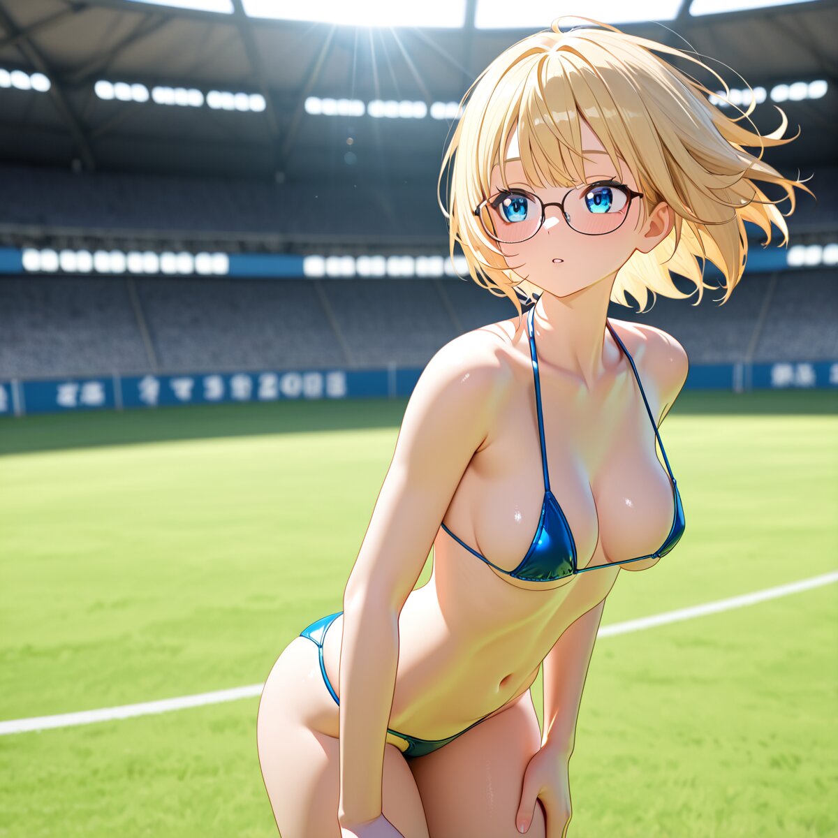 masterpiece, best quality, amazing quality, 4k, very aesthetic, high resolution, ultra-detailed, absurdres, newest, scenery, 3d, rendered, 1girl, solo, glasses, blonde hair, short hair, choppy bangs, parted lips, blue eyes, micro bikini, sports field, medium breasts, dynamic, cowboy shot, front view, facing forward, looking straight ahead, soft lighting, floating hair, BREAK, hands, vignetting, dramatic shadow, cinematic lighting, rim light, detailed background, depth of field, vignetting, volumetric lighting