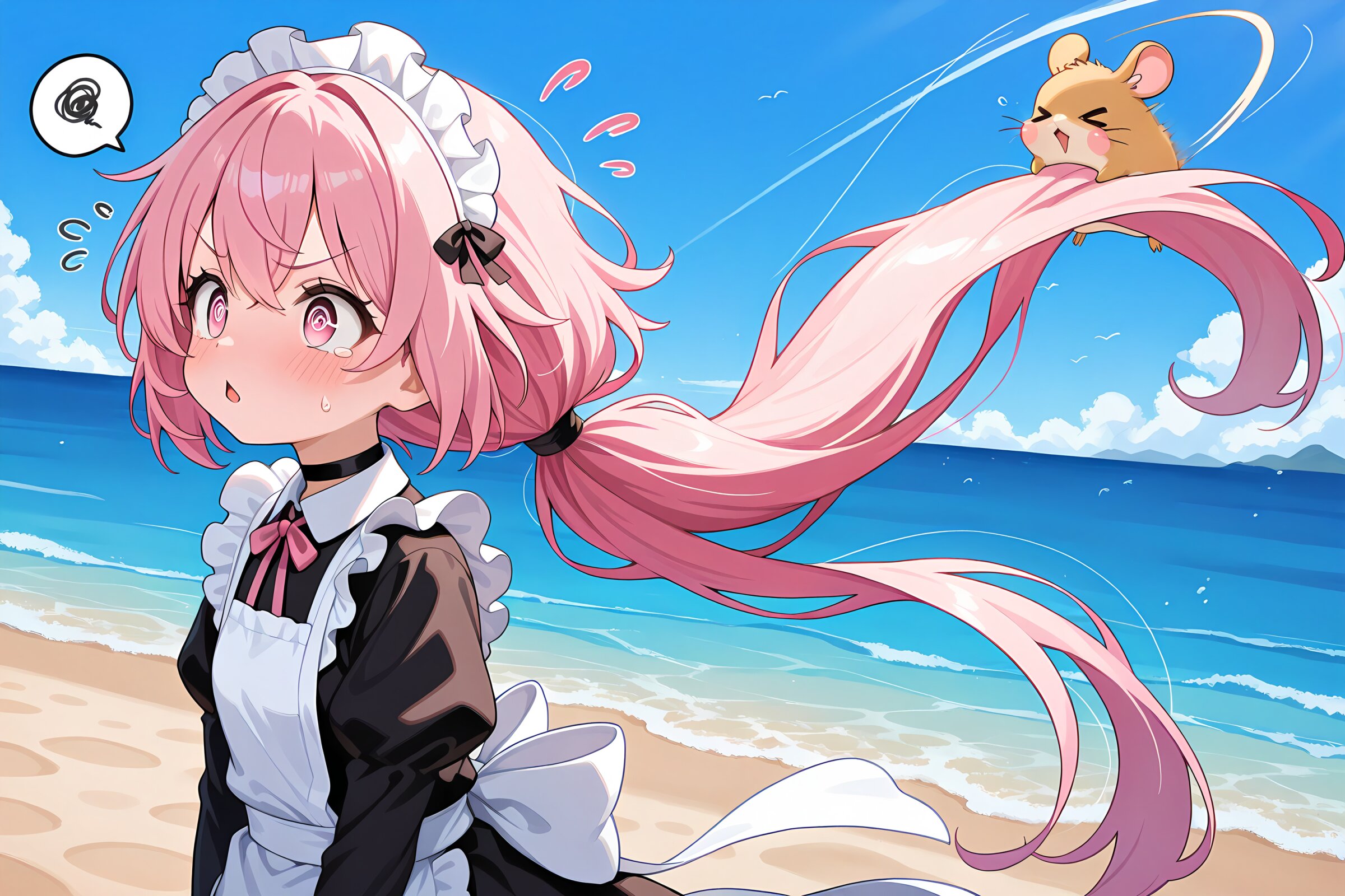 1 little girl, solo, diagonal angle, upper body, masterpiece, best quality, amazing quality, very aesthetic, pink hair, very long hair, low ponytail, wide ponytail, pink eyes, @_@, chestnut mouth, tearful, confused, troubled, angry, sweat, flying sweatdrops, shout lines, spoken squiggle, choker, maid outfit, (hamsters:1.2), > <, motion lines, motion blur, speed lins, trembling, wind, ocean, sand beach,