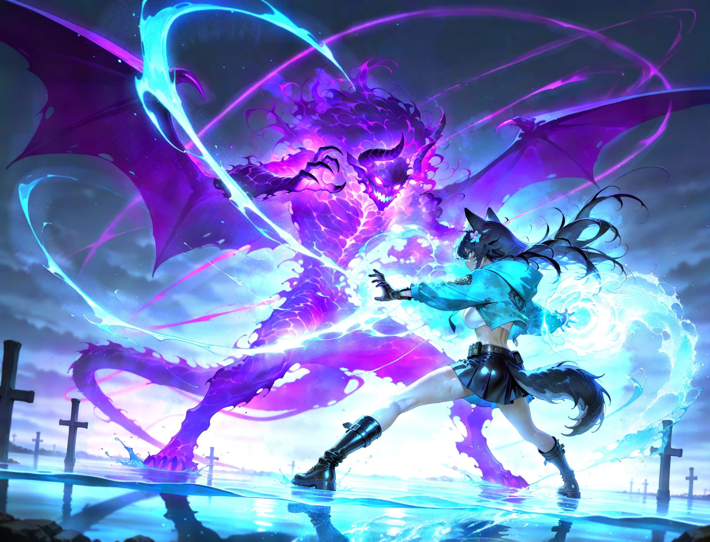 (very wide shot:1.3) from above from side facing away, looking at monster 1girl, black wolf ears, dark skin, young beautiful girl, large breasts, tall, wolf tail, (aristocratic features), (Black Hair:1.2) (disheveled long hair over ears:1.3) messy hair ornament flower, (perfect turquoise eyes:1.3) long eyelashes,, wearing turquoise hood down and white tube top leather gloves, lether miniskirt, belt boots, turquoise hoodie, water magic, , kung fu attack, kung fu pose, kung fu action, (swirling energy,energy magic,energy:1.2), water magic, partially underwater shot, partially submerged, great clear water, reflection focus, standing on liquid medieval fantasy world, battle (huge slategray silhouette of demon, demon wings, faceless monster:1.3), (slategray monster:1.2), duel, fighting, danmaku, midair incoming attack, super fine concept art, hard surface, 8K, unreal engine, masterpiece, best quality, amazing quality, very aesthetic, absurdres you can add scenery, (volumetric lighting), To make the background more distinctive. professional art lots of details, , overexposure, shiny-glistening, (watercolor style:1.0), (pastel color style:0.5) 4ur4_illu,shiny, glowing, glowing particles, glowing light particles, light particles, , <lora:noline (1):-0.5> <lora:sdxl2-flat2-512b:0.2> <lora:facelightup_xl_v10:0.5> <lora:V2_yakumo_alchemy:0.5> <lora:Aura_illu:0.1>