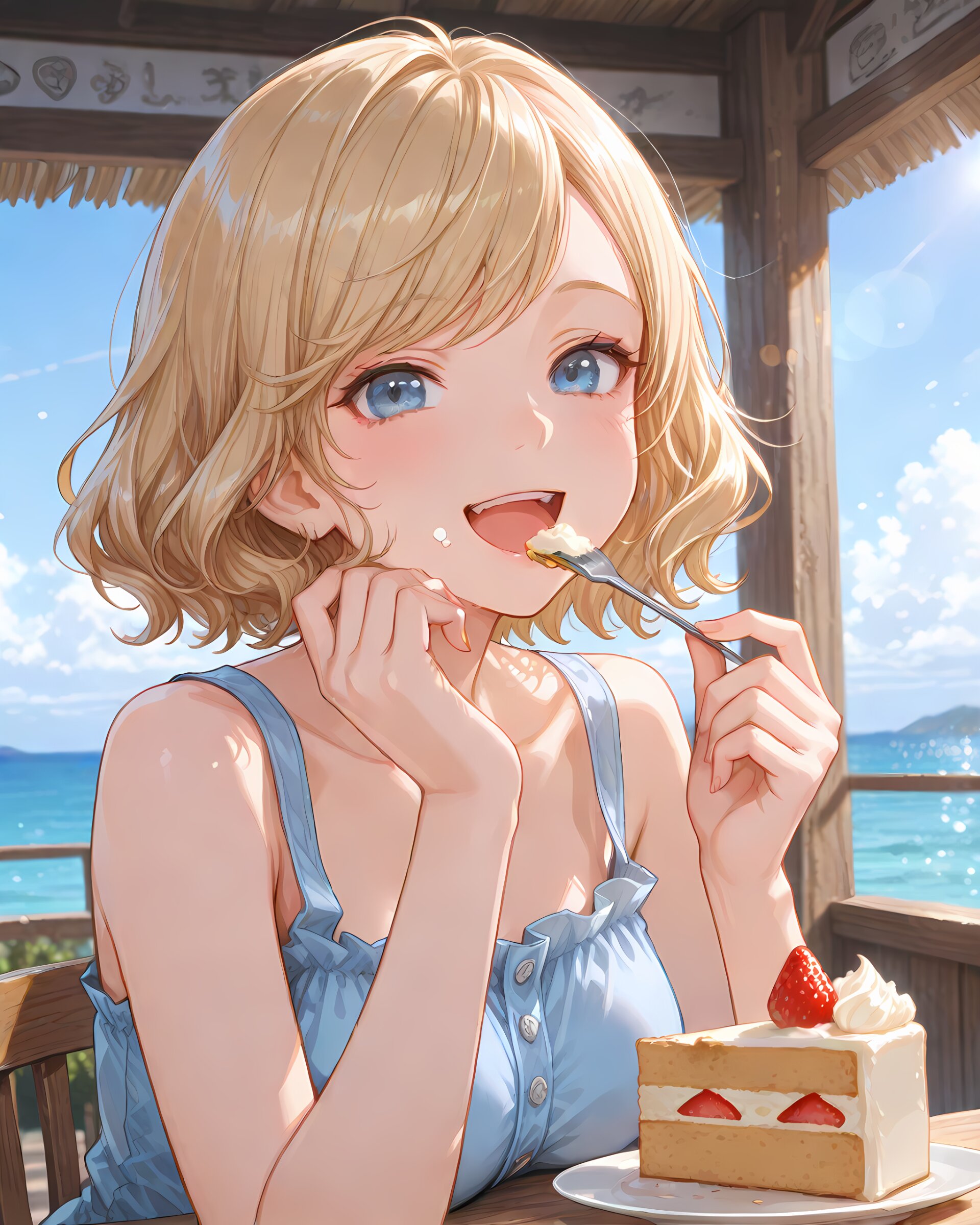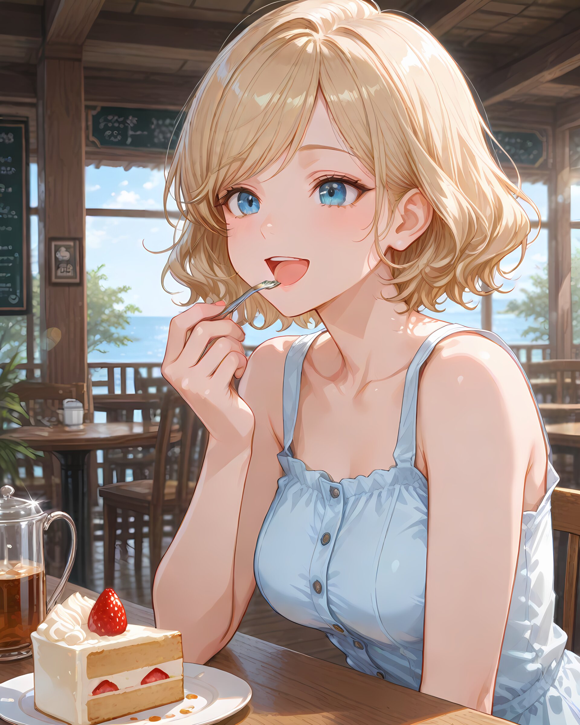 <lora:hyper_sdxl_8_step_lora_f16:1>,, 1girl, eating cake, tea, inside cafe, sea side, day, lens flare, focus face, close up, BREAK 18 years old, girl, short hair, wavy blonde hair, swept bangs, medium breasts, slender, frosty blue eyes, sleeveless tank top sundress, smile, happy, open mouth, BREAK masterpiece, amazing quality, best quality, very aesthetic, ultra-detailed, 8K,