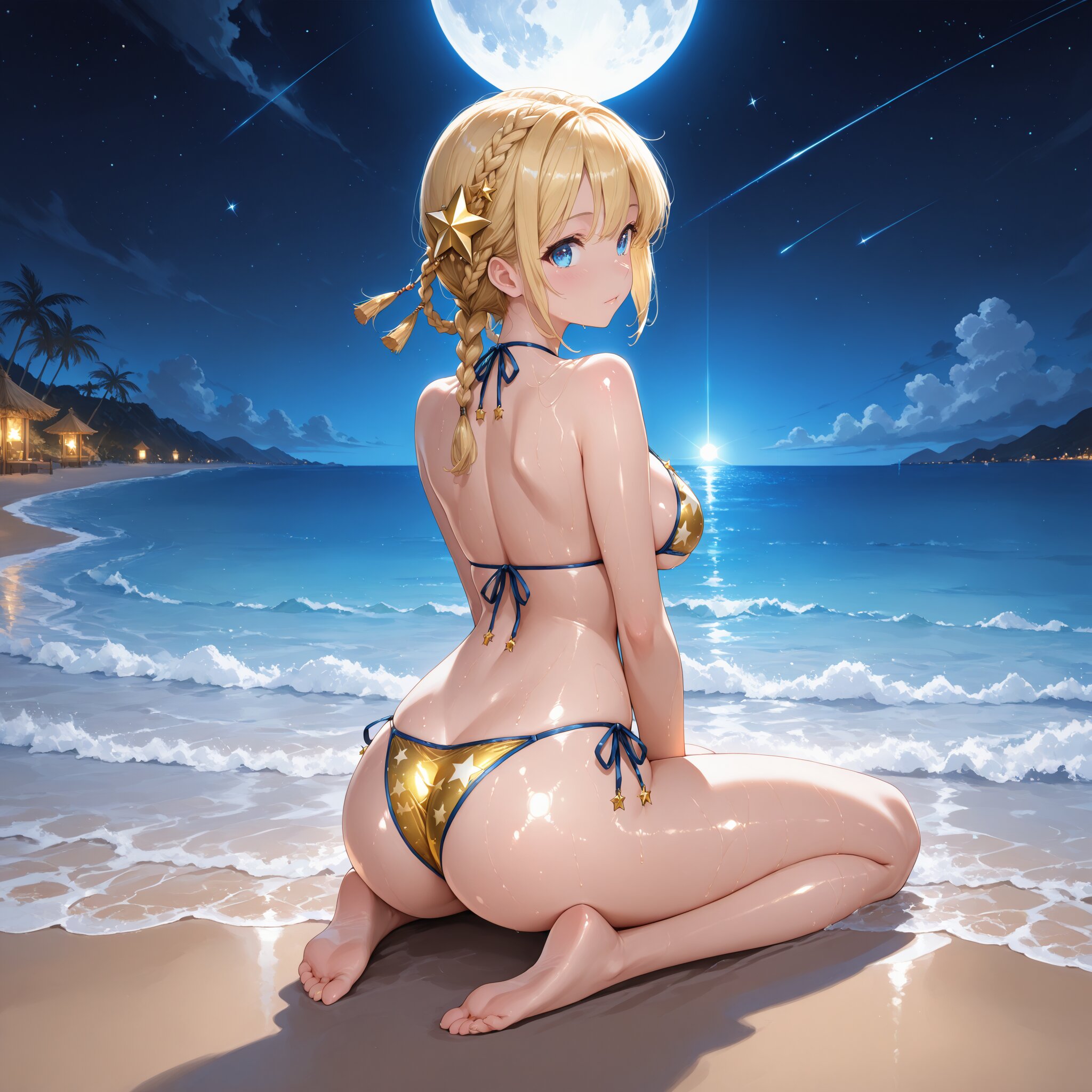 (masterpiece,high resolusion,illustration,ultra detailed 8k art,extremely detailed CG,official art,clothes reflecting light,detailed shiny skin,detailed background:1.3), ((highly detailed beautiful face and eyes)),masterpiece, best quality, 1girl, night beach, stars, moon, night blue ocean, southern beach, star bikini, back shot, indian gooseberries, lots of golden star hair ornaments, long blue braided hair, blue eyes, wheat-colored skin, sun burned, exotic atmosphere, back lighting, turn her head to the right,full body shot