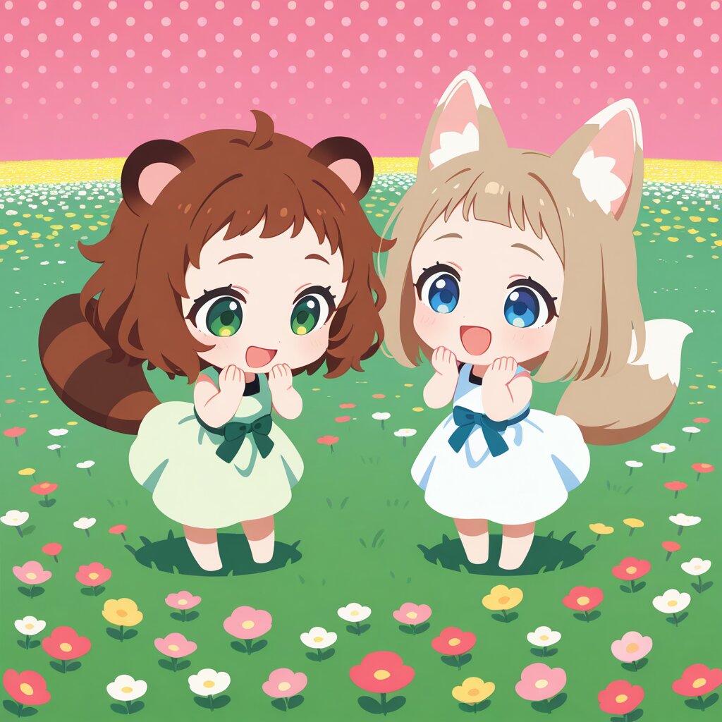 2girls, chibi, flower field background, no lineart, no outline, flat color, vector art, BREAK chibi, dark brown hair, short hair, messy hair, short bangs, green eyes, tareme, (raccoon ears, raccoon tail), light green sundress, smile, happy, BREAK chibi, light brown hair, medium hair, choppy bangs, blue eyes, (fox ears, fox tail), light pink sundress, laughing, happy, cheerful,