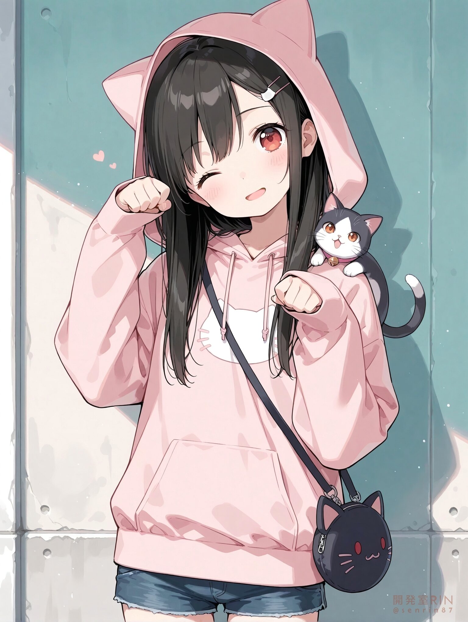 (flat color:0.1),(tareme:0.3), cute girl , orange eyes, one eye closed, straight hair ,black hair ,(hair between eyes:0.5), hairpin, kawaii, (pastel theme :0.5), (depth of field:0.7), (bokeh:0.5),(excited:0.1) ,(open mouth), smile, head tilt, cat hair ornament, BREAK playful cat on her shoulder, cowboy shot, (contrapposto:0.4), hearts,paw pose, hands up, wall, hoodie , hood_up, sleeves past wrists, cat bag , (arm up:0.3), short_pants
