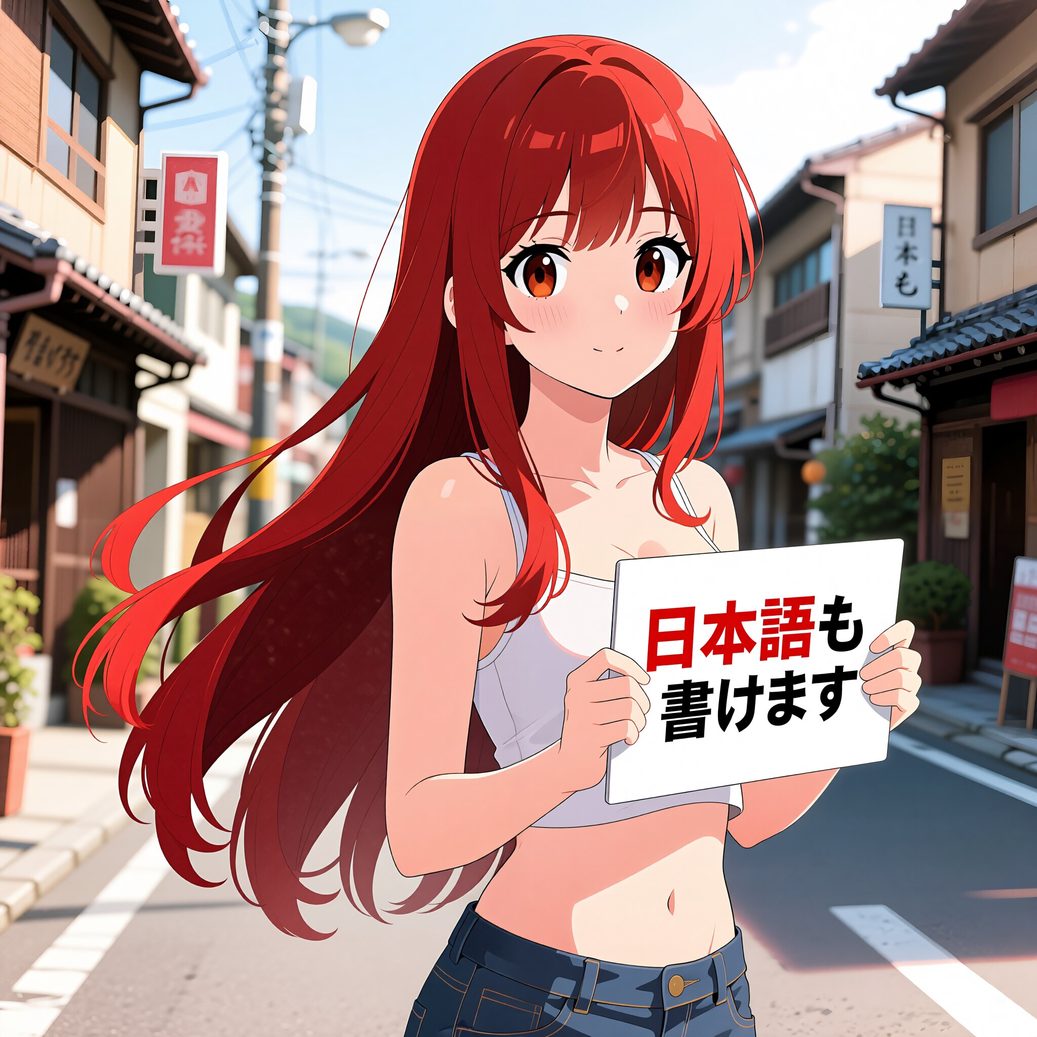 anime_style,1girl,21yo,long_hair,red_brown_hair,red_brown_eyes,hair_between_eyes,very_long_hair,floating_hair,hair_intakes,straight_hair,medium_breasts,casual clothes, on the main street at the town,holding a panel that says "日本語も書けます", on side,