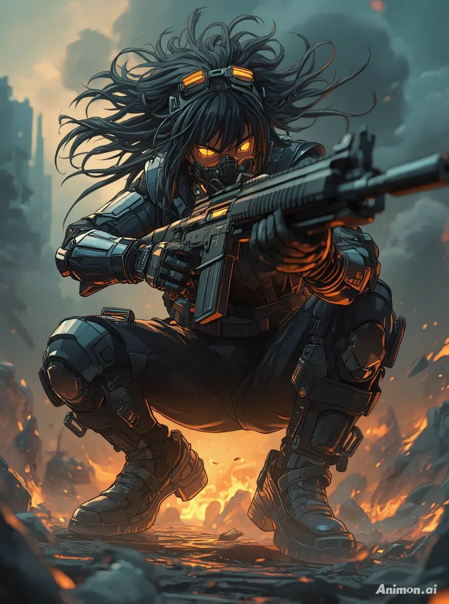 A dynamic cyberpunk warrior with wild, thick dreadlocks, wearing a dark tactical gas mask with glowing orange eyes, crouched low and aiming a large, futuristic assault rifle toward the viewer, extreme perspective from low angle emphasizing oversized combat boots in the foreground, background filled with swirling smoke, abstract mechanical parts, and fiery orange light, cinematic lighting, ultra-detailed, hyper-realistic digital painting, dramatic contrast, vivid textures, 8K resolution.