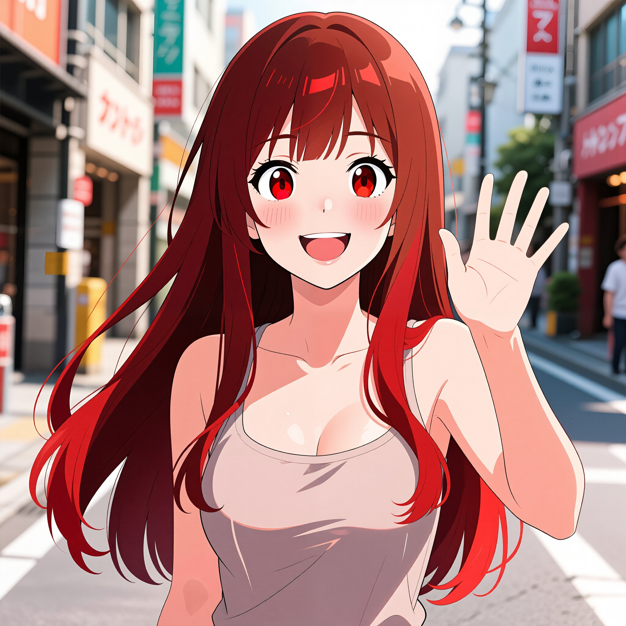 アニメ風の21歳の女性。彼女は赤茶色の長いストレートのロングヘアーで赤茶色の目をしており、両目の間に前髪が垂れている。彼女の髪にはヘアインテークがあり、髪はふわりと浮いている。彼女の胸の大きさは普通程度。彼女はカジュアルな服装をしている。彼女は街中のメインストリートに立っており、こちらに向かって笑いかけながら手を振っている。