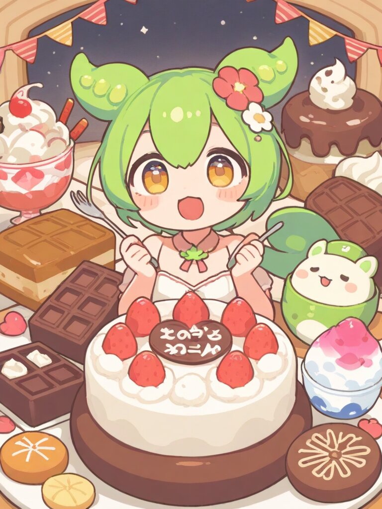 zundamon,voicevox Summer pop-up party, cake, chocolate, shaved ice, coffee, strawberry daifuku, flower decorations,