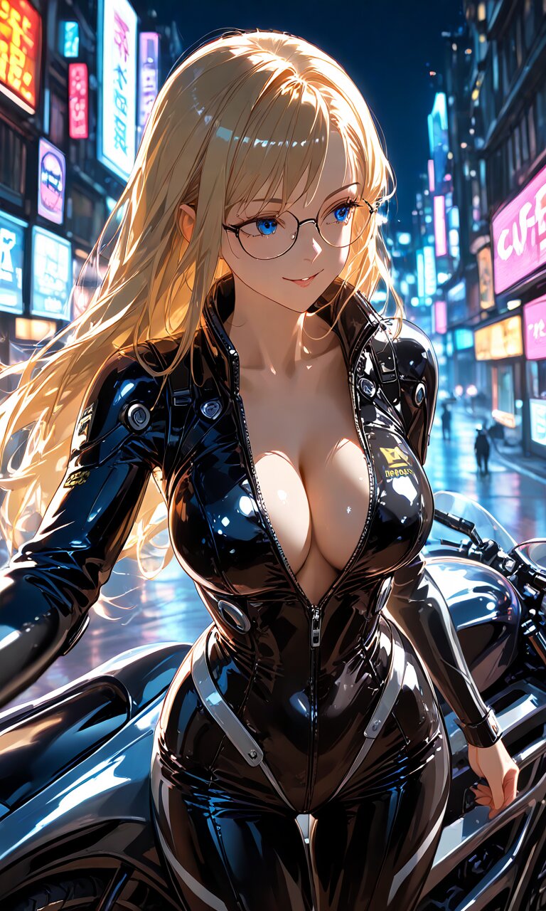1 lady, blue eyes, long hair, , blonde hair, looking away, smile, glasses,, big breasts, black bodysuit, ((unzipped, cleavage)) standing, motorcycle, (cyberpunk), night