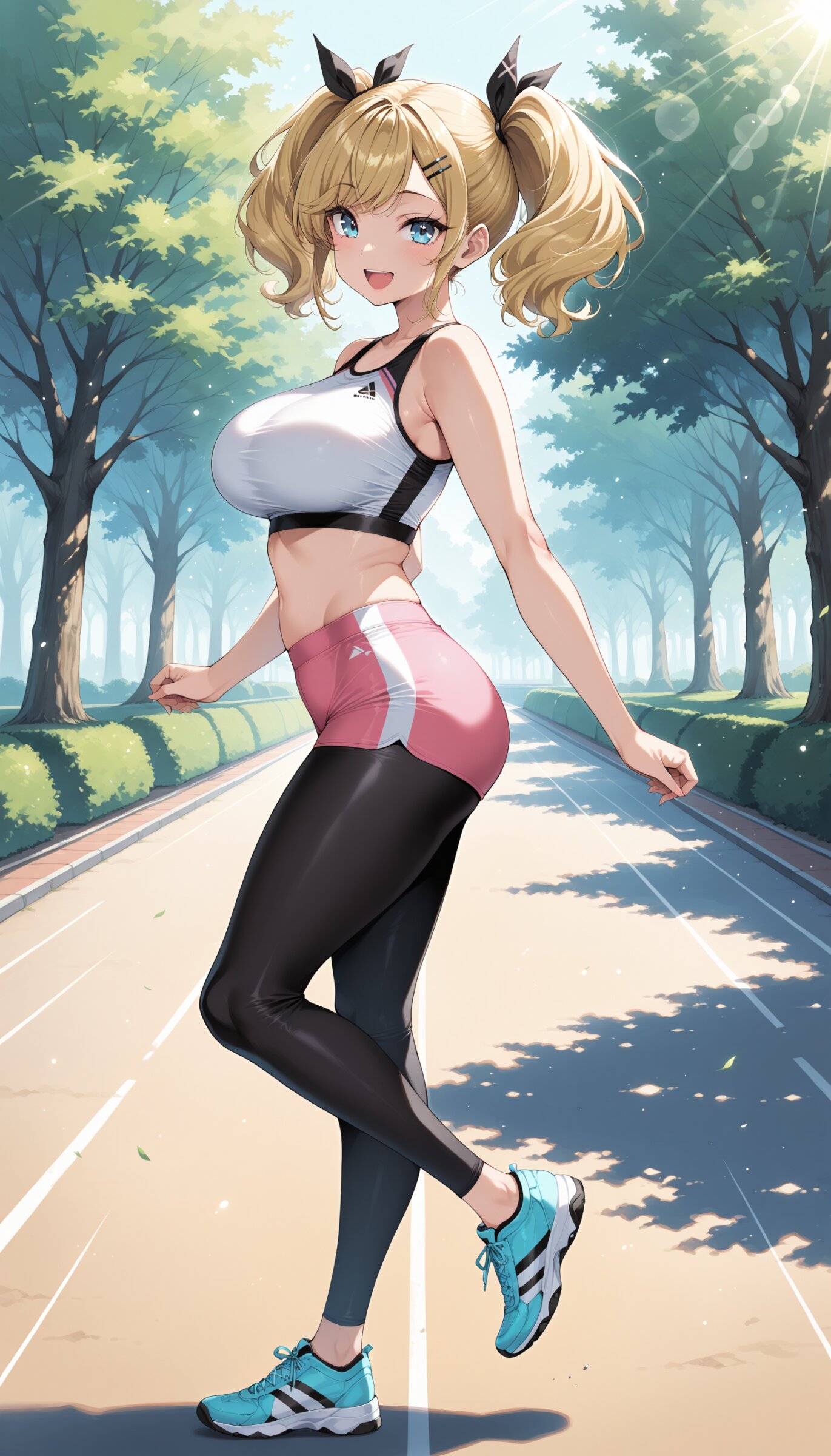 masterpiece,best quality,amazing quality,general, fine detail, official art,light particles,1girl,curvy,solo,;D,blonde hair,twin tails,high twin tails,short twintails,black hairpin,big hair,black ribbon,bangs covering eyebrows,sidelocks,blue eyes,small eyes,(tsurime:1.1),long eyelashes,big breasts,Running,speed lines,white cropped sports top, pink short athletic shorts, black full-length leggings underneath, form-fitting, moisture-wicking fabric, minimal design,from side,lens_flare,scenery,in park,full body,