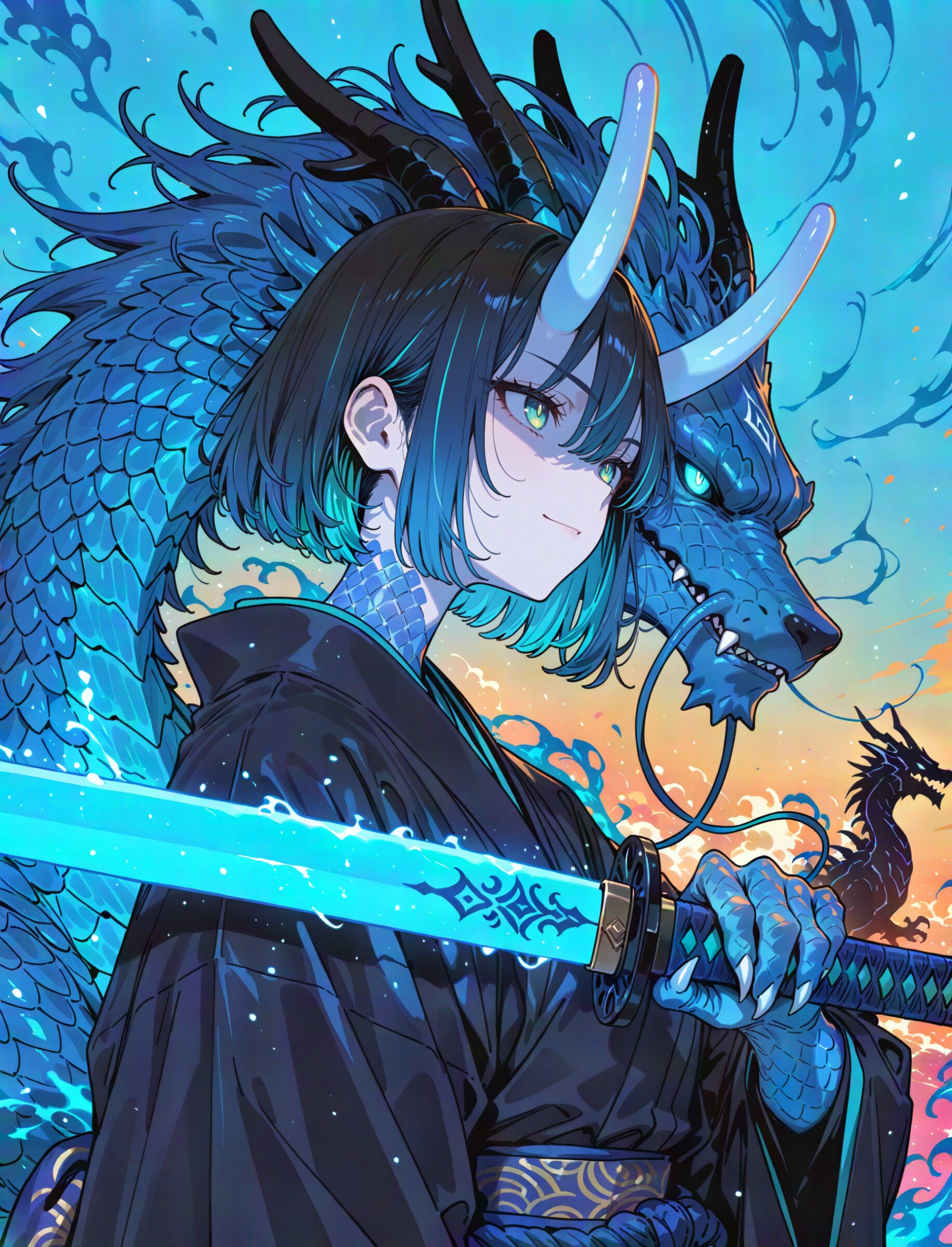 super fine concept art, hard surface, 8K, masterpiece, best quality, amazing quality, very aesthetic, absurdres, from side, (upper body:1.15) (from above,looking up:1.0) , (dutch angle:1.2), The silhouette is composed of dynamic, horizontal-striped and vibrant cones. The background is a solid, creating a striking contrast with the intricate, multi-colored design of the character, summer atmosphere. glowing wolf energy, cobalt blue silhouette of serious wolf guardian, huge wolf aura, 1boy, monster boy, creature, (monster focus:1.0), serious dragon, dragon head, dragon face, horns, orange body, scales, monsterification, tusks, dragon foot, dragon hands, dragon claws, samurai, (muscular male:0.5), Sleek haircut, hair between eyes glowing hair, blue pupils, beautiful lime green eyes, ,, (holding Japanese pale blue sword:1.3), scabbard, (floral print kimono:0.8), , seigaiha,, broad shoulders, tabi, (false smile,shaded face:1.1), seductive smile, unsheathing, scabbard, battoujutsu stance (swirling ink effects:1.2) blocking, The background is a solid, bright cobalt blue, creating a striking contrast with the intricate, multi-colored design of the character, (dancing silhouette:0.0), pop color background, (high saturation:1.2), summer coloring, partly black ink wash effect, professional art lots of details, , overexposure, sumie effect style, 4ur4_illu,shiny, glowing, glowing particles, glowing light particles, light particles, cobalt blue wind, <lora:noline (1):-0.5> <lora:sdxl2-flat2-512b:-0.2> <lora:facelightup_xl_v10:0.5> <lora:V2_yakumo_alchemy:0.5> <lora:Aura_illu:0.1>