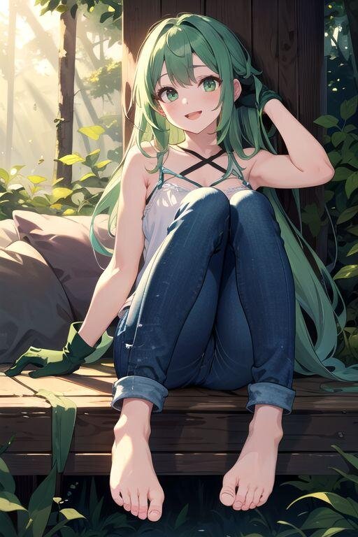 green hair, very long hair, green eyes, gloves, barefoot, (long toes:1.3), (long jeans:1.4),smile,open mouth, camisole, forest background