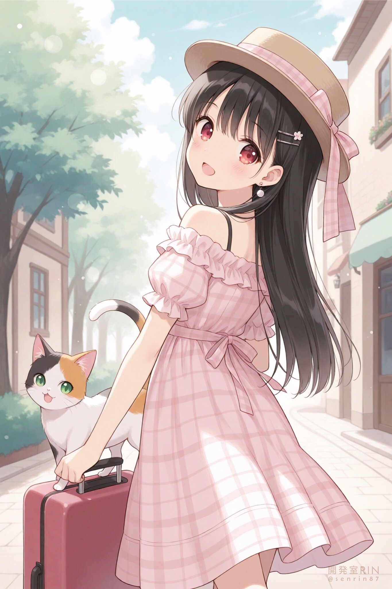 (flat color:0.1),(tareme:0.3),(playful cat:1.2) , cute girl , walking , ruby eyes, straight hair ,black hair ,(hair between eyes:0.5), hairpin, kawaii, (pastel theme :0.5), (depth of field:0.7), (bokeh:0.7),(:D:0.7),(excited:0.4) , head tilt, looking back, BREAK casual clothes, off-shoulder dress, plaid clothes, hair ornament, earrings, puffy short sleeves, town, outdoors, nature, background,rolling suitcase, cat on luggage, headwear, boater hat with ribbon , (from behind:0.3), contrapposto, cloud,