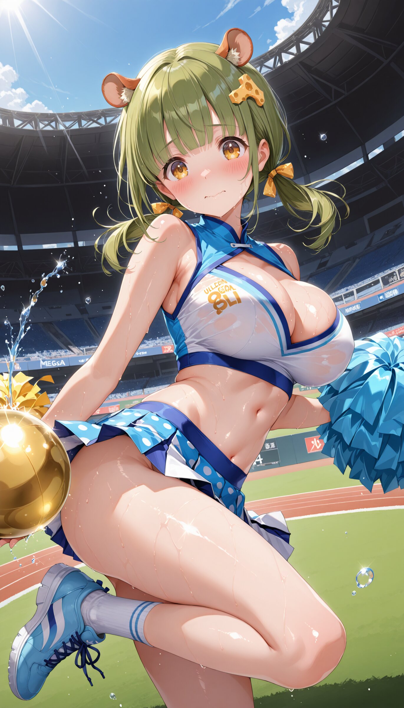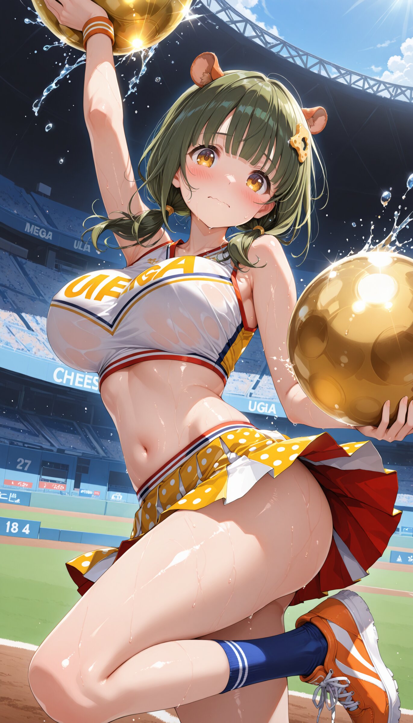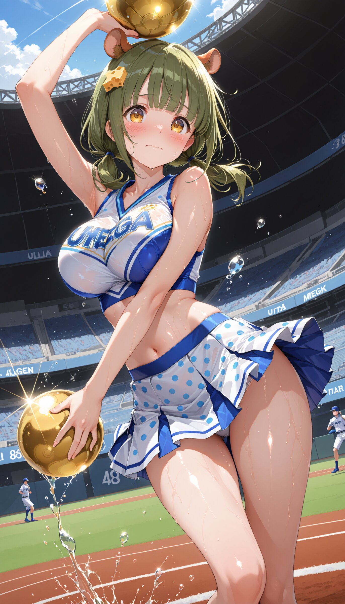 (masterpiece,high resolusion,illustration,ultra detailed 8k art,extremely detailed CG,official art,clothes reflecting light,detailed shiny skin,detailed background:1.3),1 girl, 13 years old,(hamster ears), ((cheese hair accessory)), (medium hair), green hair,orange inner hair , ((low pigtails: 1.2)), blunt bangs, gold eyes, (blush: 1.1), wavy mouth, sweaty,(mega breasts), cheerleader costume, polka dot skirt,cheer up,((golden ball:1.2)),((water splash from golden ball)),dancing,holding pompom,dynamic angle,dynamic action,baseball Stadium,summer