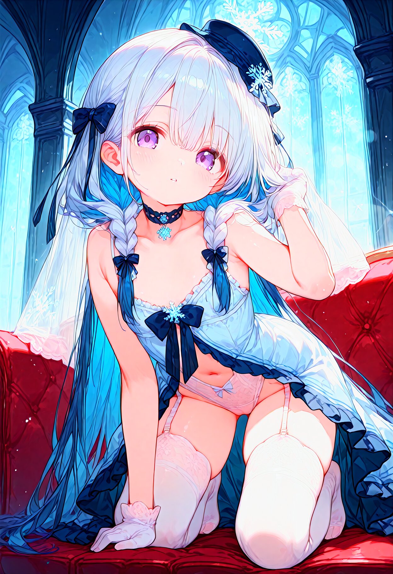 beautiful detailed background, best quality, (pale color:1.1), dark theme, pastel colors, lens flare, collarbone, parted lips,(Expressionless:0.8), big eyes,(half-closed eyes:0.8), tareme, pale purple eyes, thighhighs, (silver hair:1.2), (dark blue hair colored inner hair:0.8), long hair,twin braids, front braid, eyebrows visible through hair, navel, snowflakes, sparkle, crystal,snowflake_print,gloves, white and( darkblue:1.1) two-tone dress,(see-through:1.1), see-through veil, mini hat, blue strapping ribbon and bow, frills, strapping ribbon, choker, round lighting, temptation, reflection, on all fours, crystal, church, couch, on couch, <lora:sdxl2-flat2-512b:-1.3> <lora:noline-16oa:-1.0> <lora:sdxl-shadow_01:-0.7>