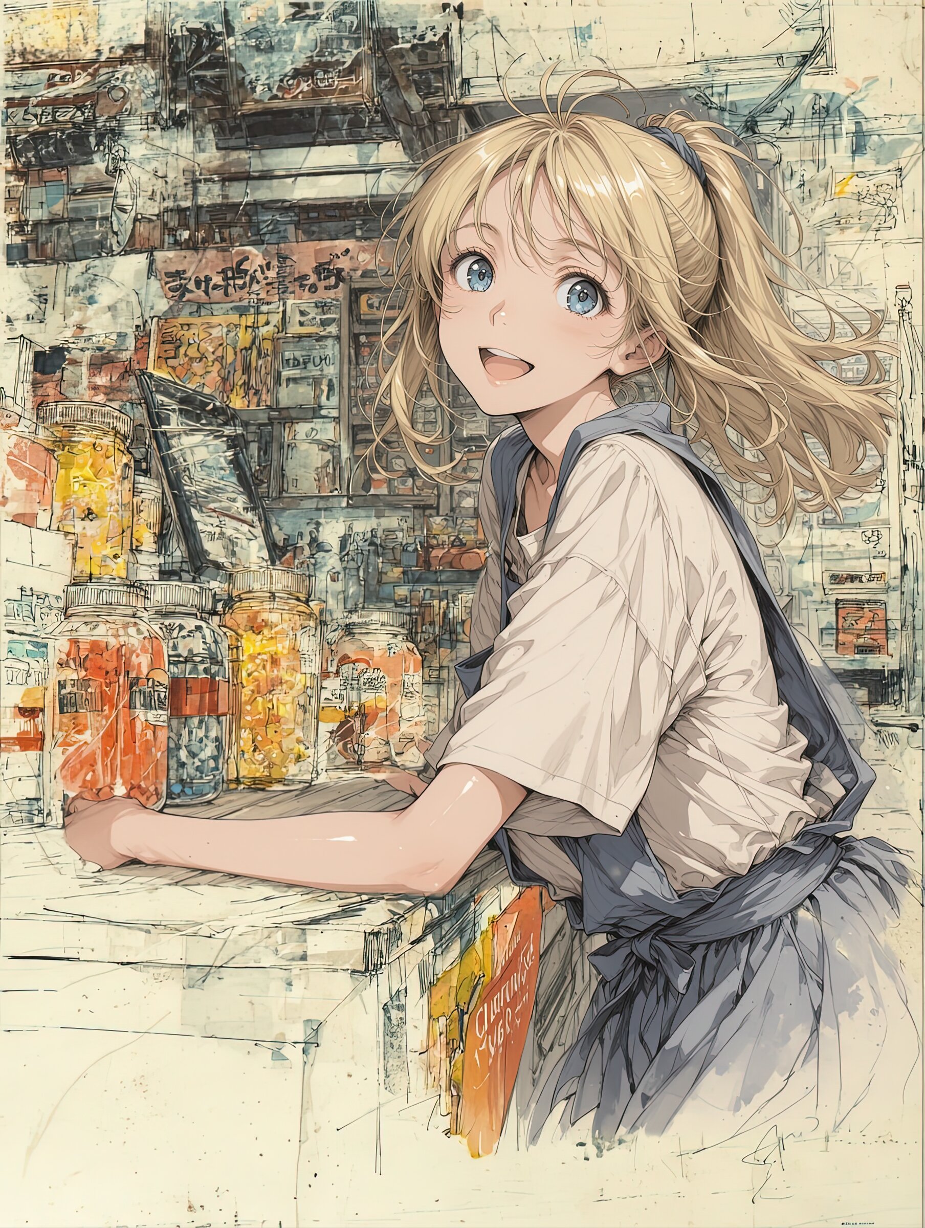 masterpiece, best quality, Hand-drawn sketch style, line drawings, rough shading, crosshatching, minimal coloring, vintage manga style, soft natural light, illustration style as if in an art book, line and wash, photographic angle, realistic background, anime style character, anime-style illustration, 1girl, (young girl), small body, beautiful face and eyes, Beautiful, clear, curious blue eyes, Beautiful hair, floating hair, shoulder length hair, (blonde hair), bobbed hair with ponytail, antenna hair, ahoge, shiny skin, pretty, (flat chest), (small breasts), active personality, smile, open mouth, content, nostalgic composition, small wooden shop, colorful candy jars, old vending machines, low counter, cheerful yet worn-out shopkeeper, faded posters, dynamic pose, cinematic angle, official art, official wallpaper