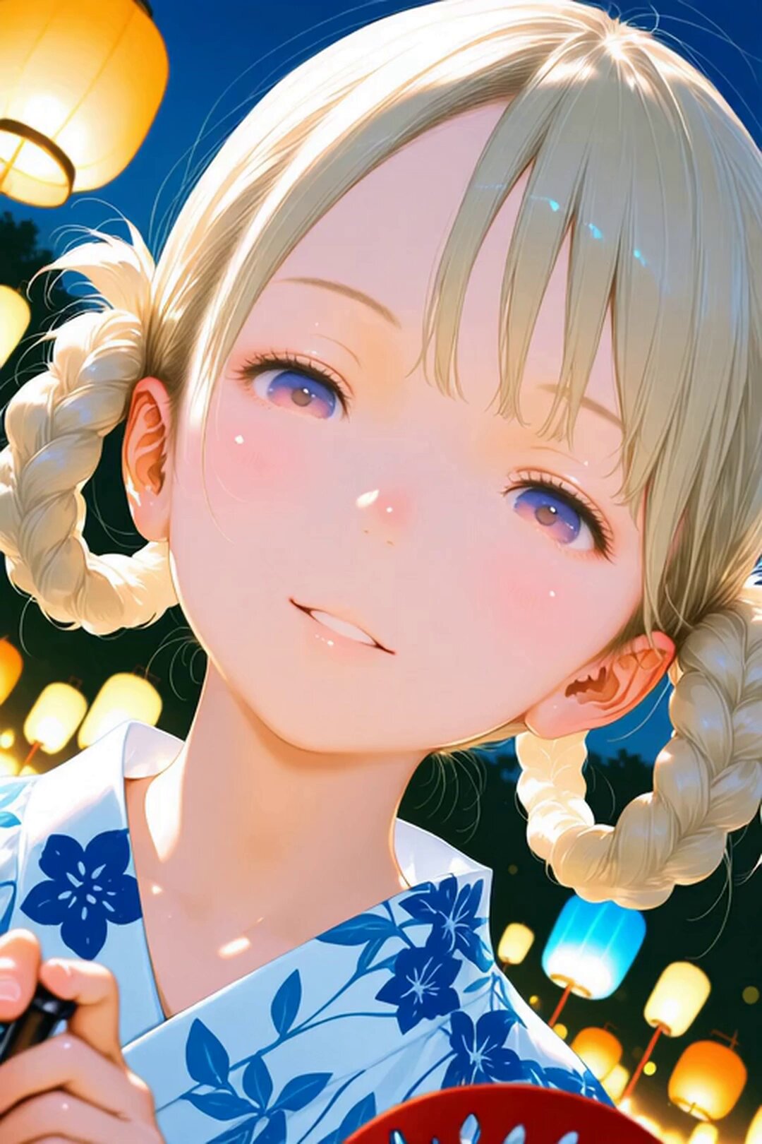 #動画 Nijivideo POV, 1girl, close her eyes, ending in a close-up of her lips. #イラスト model:DRAGON (delicate illustration), (super dynamic angle from below), diagonal view. 1girl, pale skin, smooth skin, platinum blonde hair, shiny hair, (braided hair rings), back bows, (hair swaying in the wind), looking at viewer, Archaic expression, portrait, BREAK (several glass wind chimes), soft highlights, watercolor style, (long slender branches swaying gently in the wind:0.8), BREAK modern yukata outfit, overlapping kimono collar, wearing a frilly blouse underneath, visible frilly blouse collar, delicate lace-trimmed cuffs peeking from the sleeves. striped and floral mixed pattern on yukata, summer yukata made of cool material with striped and floral mixed pattern, BREAK kinchaku, uchiwa, (light of summer illustration, glowing wind chimes, ultra-intricate detailed), flat design, bold colors, patterned fabric, beautiful composition. BREAK insanely beautiful and detailed clothes, extremely shiny hair, beautiful small face, (big round eyes, highly detailed eyes), long eyelashes, double eyelids, parted lips, smile, kawaii, cute, (flat chest, covered nipples:0.6), slender, {exquisitely delicate skin}, perfect anatomy, dynamic angle, dynamic pose, BREAK ((DOF), blurry foreground), sharp focus on the girl, emphasizing depth, perfect AI rendering, three-quarter view, realistic background, BREAK (masterpiece, aesthetic quality, 8K, ultra-detailed), (perfect design, realistic complex), absurdres, highres, hyperrealistic, photorealistic, soft lighting,