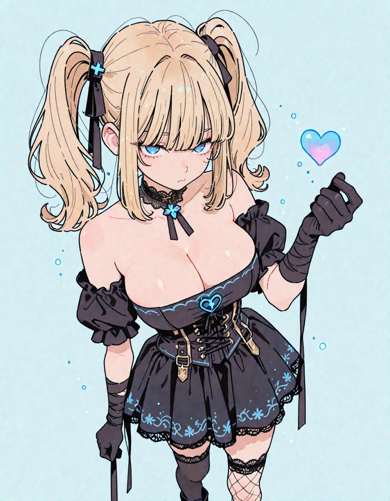 from front (close up:1.0), knees out of frame (from above,looking up:1.2) dutch angle looking at viewer, 1girl, mature female,, blonde hair, medium hair, messy hair, twin tails, high twin tails, big hair, straight hair, black string hair clip, long bangs, bangs covering eyebrows, long sidelocks, blue eyes, tsurime, sanpaku, gothic lolita, all-black costume, black choker with lace decoration, black lace decoration connected to choker covers neck and shoulders, matte black silk dress, dirndl, off-shoulder, horizontal neckline with black frill decoration, square neckline, strapless, short puff sleeves, voluminous puff silhouette, black leather waist cincher shaped bodice, large breasts, underboobs supported from below waist cincher, black eyelet belt attached to bottom of corset, gold buckle, black flared skirt, wide A-line, lace decoration on skirt hem, black belt around arm, black bandage wrapped around arms, black gloves, bare thighs, asymmetrical thighhighs stockings with ribbon decoration, (fishnet thighhighs:1.0) on one leg, opaque black thighhighs on one leg, black platform boots with heels, bare shoulders, beckoning standing , (simple background:1.0), (light blue background:1.0), masterpiece, best quality, amazing quality, very aesthetic, absurdres, newest, professional art lots of details, , overexposure, shiny-glistening, (watercolor style:1.0), (pastel color style:0.0) 4ur4_illu,shiny, glowing, glowing particles, glowing light particles, light particles, light blue heart <lora:noline (1):-0.5> <lora:sdxl2-flat2-512b:0.15> <lora:facelightup_xl_v10:0.5> <lora:V2_yakumo_alchemy:0.5> <lora:Aura_illu:0.1>