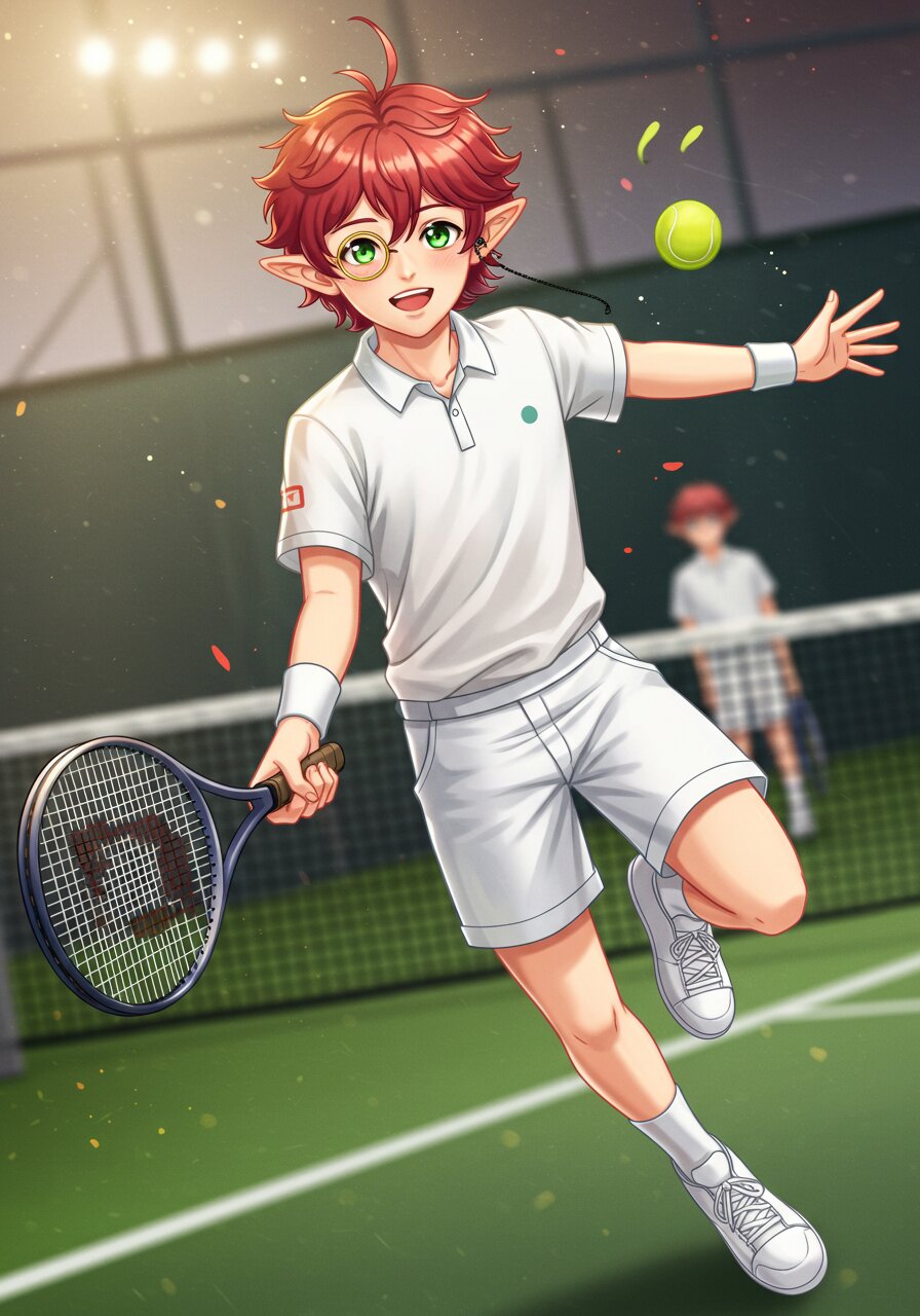 A young, elf-eared boy with fluffy, vibrant red hair styled similarly to Ragatha from "The Amazing Digital Circus". His left eye is covered with a monocle. He has gentle green eyes and a shy, innocent-looking face. He is wearing a modern men's tennis outfit: a crisp white short-sleeved polo shirt with subtle breathable fabric texture, paired with comfortable white tennis shorts. A light sweatband is worn on one wrist. His footwear consists of clean white sports socks and professional white tennis shoes. He is captured mid-motion in a dynamic tennis swing, holding a tennis racket as if hitting an unseen ball. His body is angled naturally, stance balanced and energetic, showing determination mixed with a hint of excitement. Do not include a tennis ball in the scene. The background depicts a simple, softly lit tennis court with realistic details, slightly blurred to emphasize his movement. The art style is semi-realistic anime, with soft shading, smooth motion lines, and detailed fabric textures.