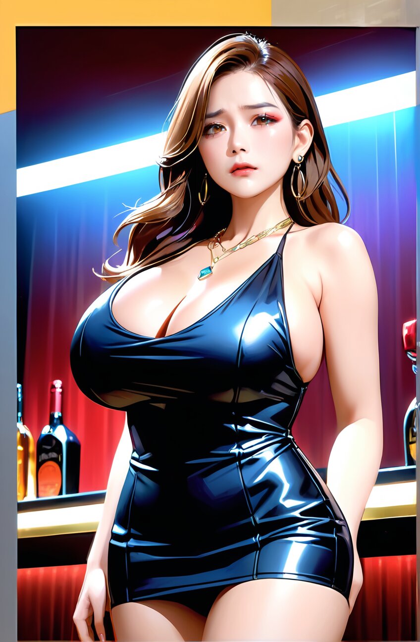 from front, (8k, best quality, masterpiece:1), (realistic, photo-realistic:1.4), (sexy posing, random angle: 1.6), 1woman, 44 years, widow, looking away, long hair, (huge breasts:1.8), beautiful detailed face, perfect skin, detailed skin texture, (black mini dress, panties, Necklace, Earrings: 1.6), (cowboy shot: 1.4), (posing in the night club, dark night: 1.4), <lora:masako V01:0.8>