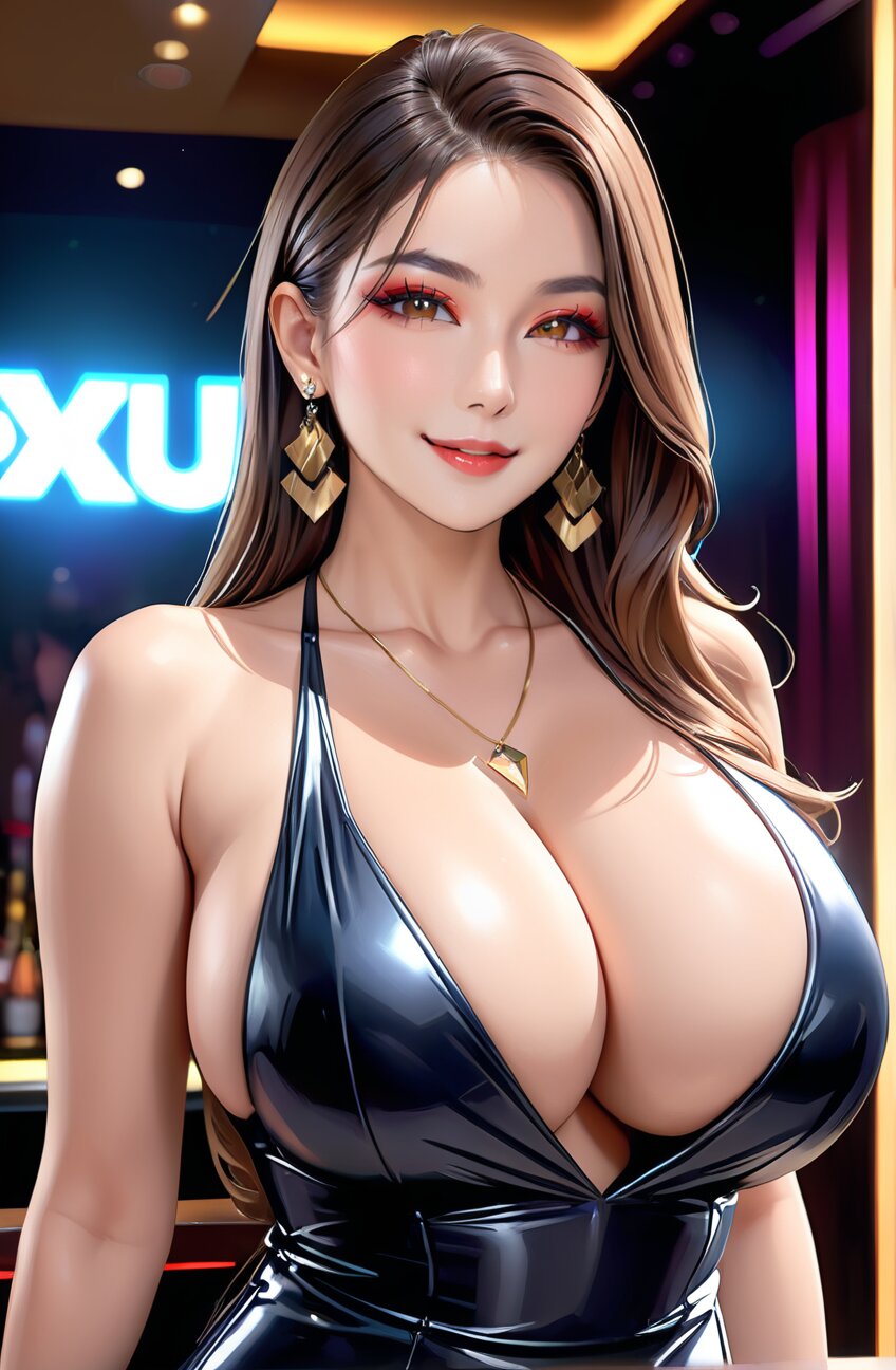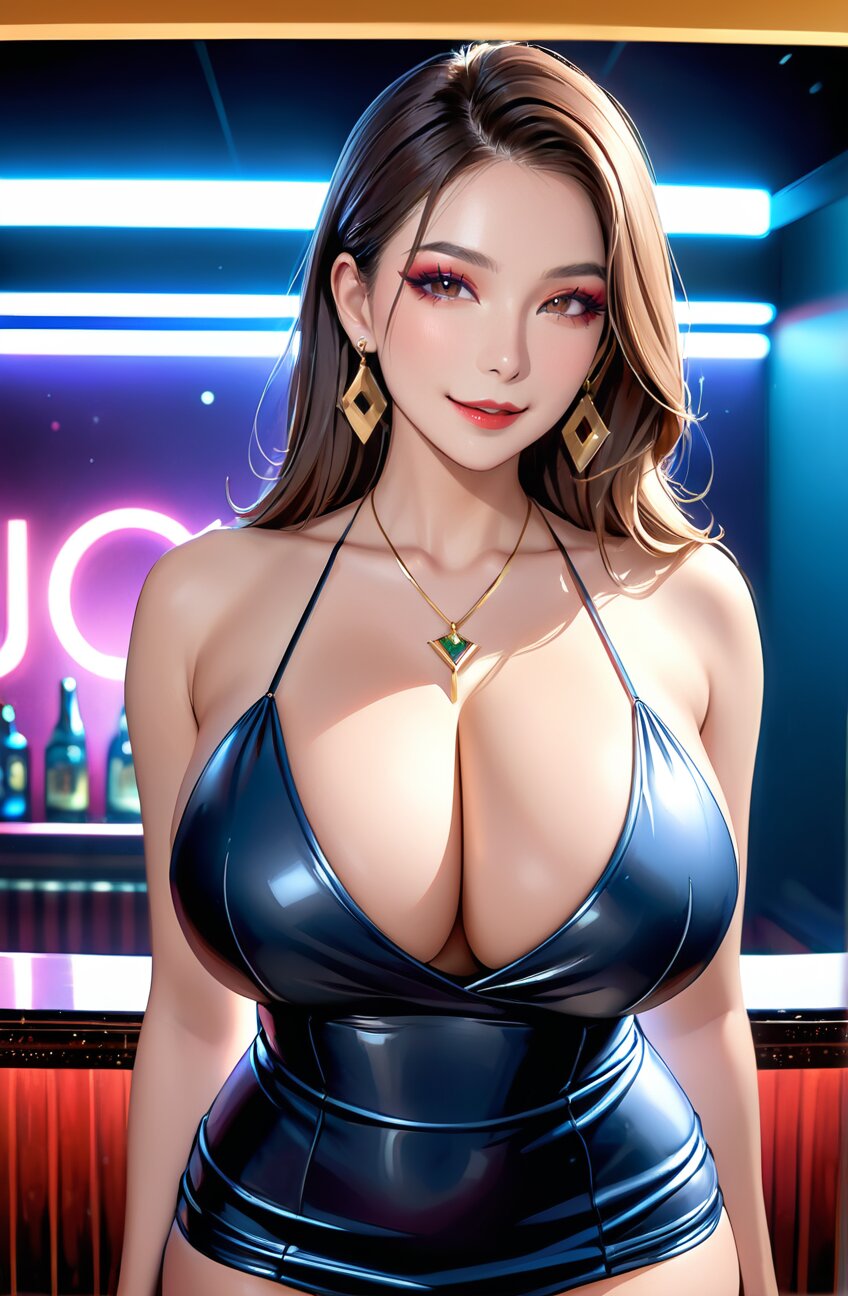from front, (8k, best quality, masterpiece:1), (realistic, photo-realistic:1.4), (sexy posing, random angle: 1.6), 1woman, 44 years, widow, looking at viewer, long hair, (huge breasts:1.8), beautiful detailed face, perfect skin, detailed skin texture, (black mini dress, panties, Necklace, Earrings: 1.6), (upper body: 1.4), (posing in the night club, dark night: 1.4), <lora:masako V01:1>