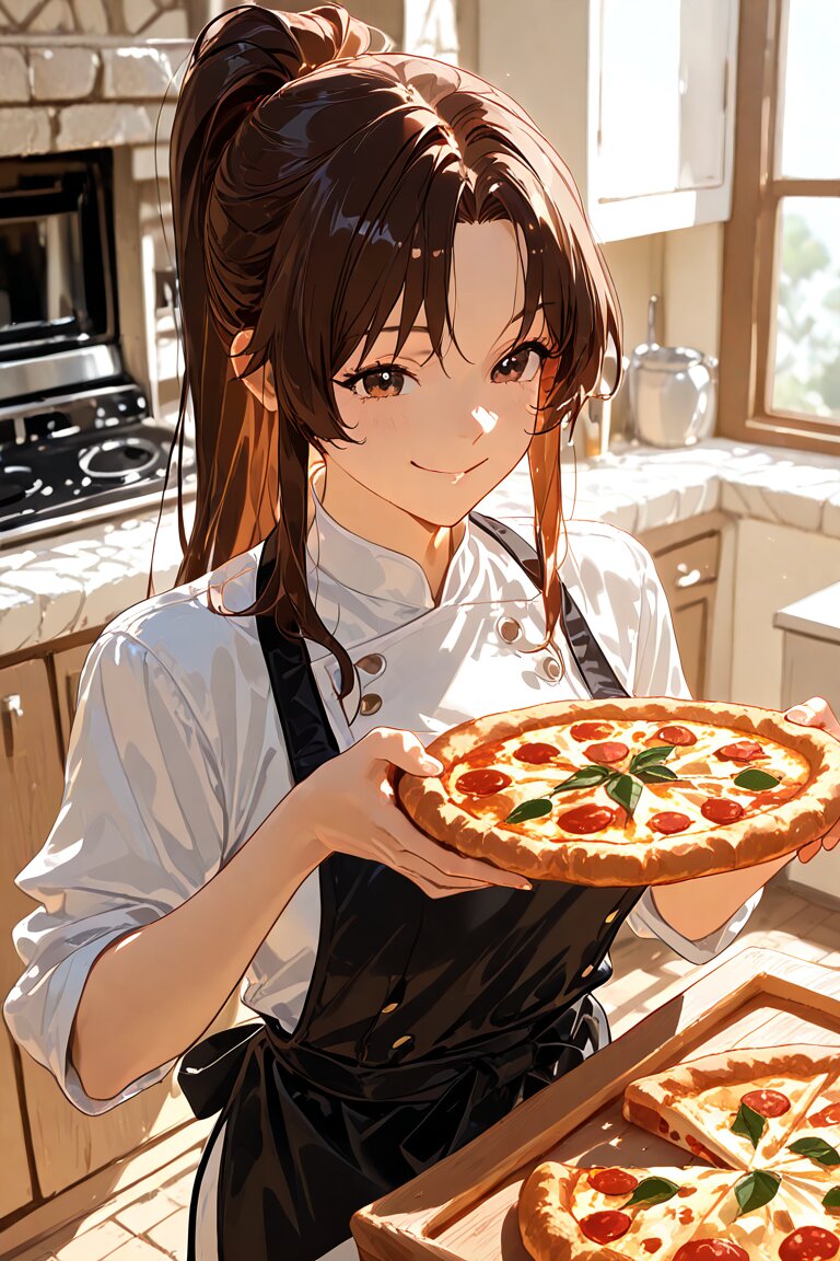 1 lady, brown hair, long ponytail, smile ((baking pizza, stone oven)), chef cloth