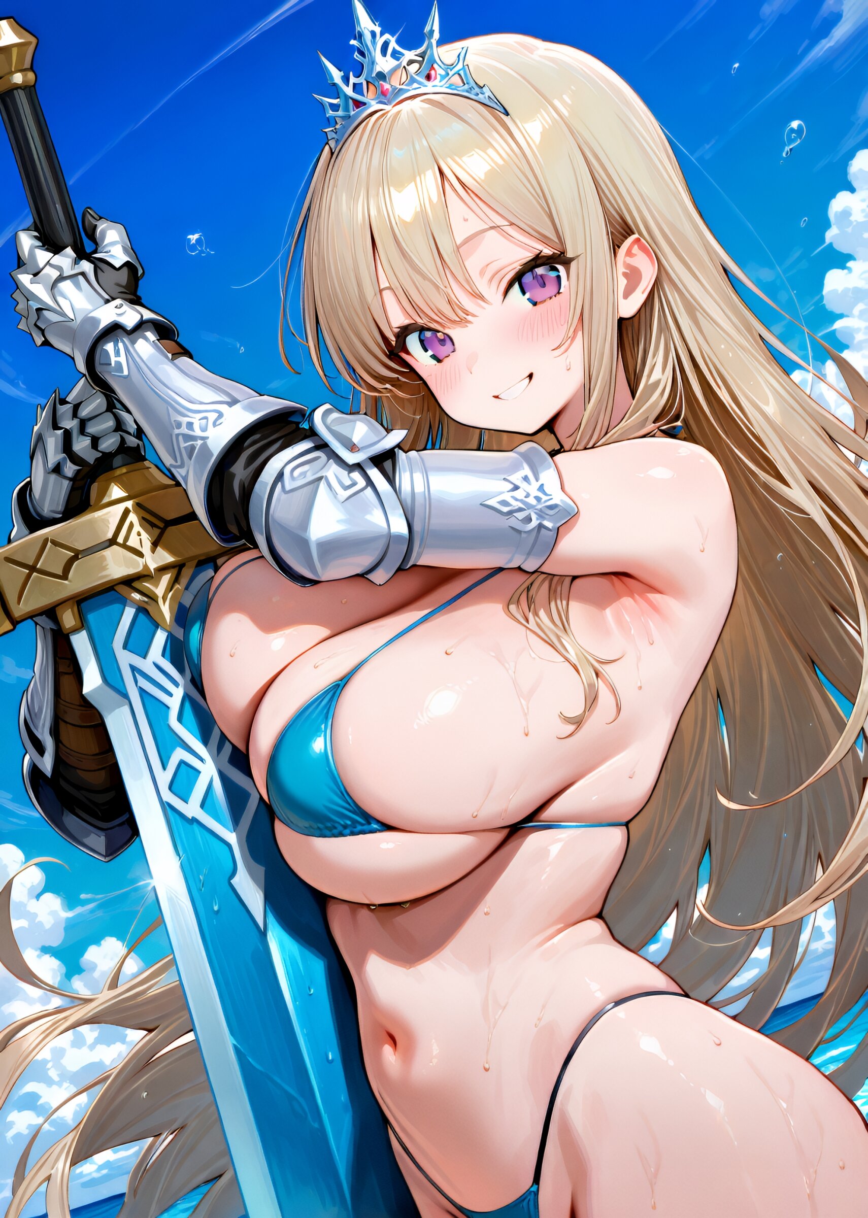 (upper body1.8), 1 cute girl, (micro bikini), (thong),(heavy gauntlets:2.2), (large breast), (enormous great sword:1.2), (oversized sword strapped on back), smile,(very long hair), (large tiara:1.5), (masterpiece), (best quality), (8k resolution), very aesthetic, amazing quality,(dynamic angle:1.4),(dynamic pose:1.4), <lora:noobai_ep11_stabilizer_v0.11_fp16:0.7> <lora:StS-Illustrious-Detail-Slider-v1.0:2.> <lora:sdxl-hairdetailer_02:2> <lora:xl_more_art-full_v1:1>