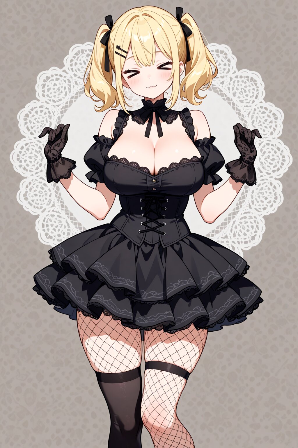 1girl,> <,glamor,curvy,solo,light smile,blonde hair,twin tails,high twin tails,short twintails,black hairpin,black ribbon,bangs covering eyebrows,sidelocks