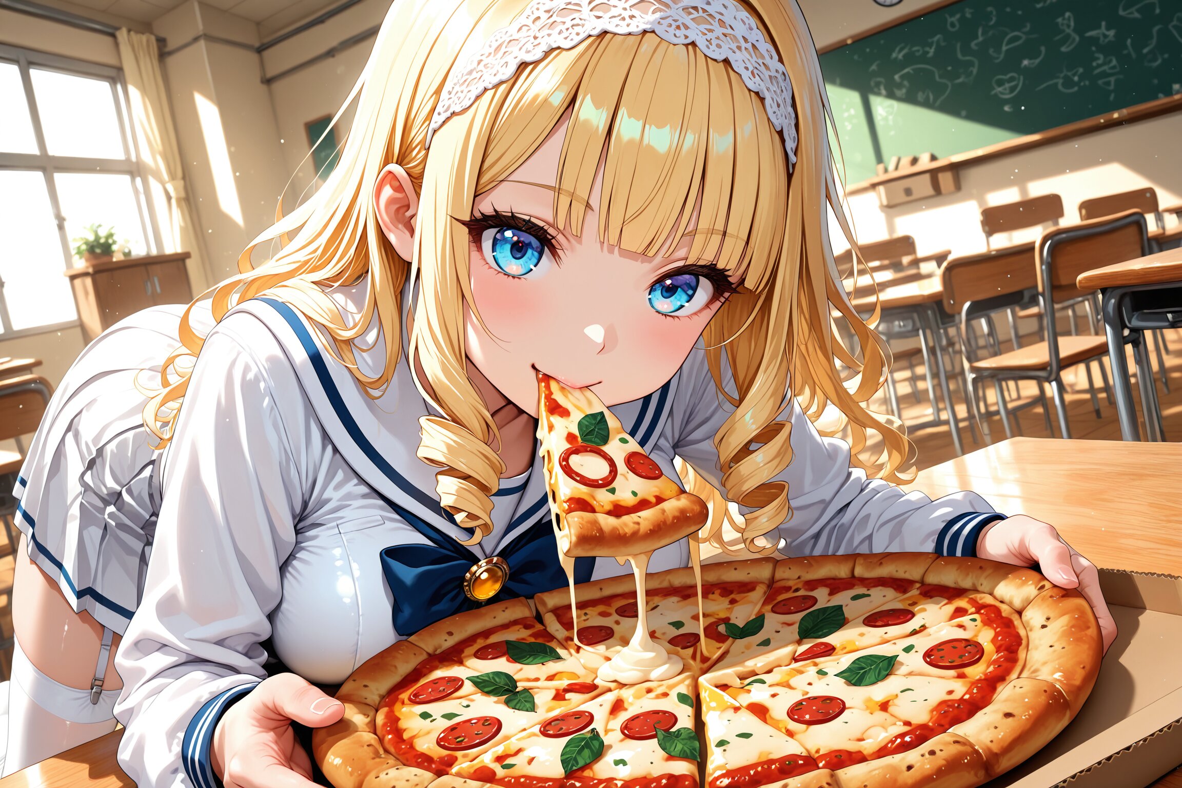 「みんなでピザ食べよー!」とクラスメイトたちが歓声を上げる。