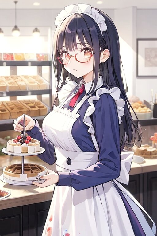 (watercolor,tegaki:1.2), (Pastel Color: 1.3), 1girl, long hair, side tail, black hair, brown eyes, maid clothes, (red-rimless eyewear:1.2), cafe, various sweets, delicious sweets, cakes, pudding, waffles, cookies,fabrous feminie softy breast,embarrassing,