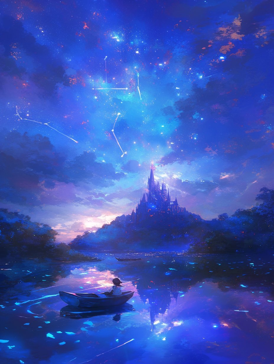 深い夜空の下、煌めく星々が静かに瞬きながら、幻想的な光の河が流れ出す。そこには、色とりどりの宝石のような光が散りばめられ、まるで夢の中の世界のように輝いている。柔らかな光線が空を覆い、虹色の光芒が織りなす壮麗な風景が広がる。遠くに浮かぶ幻想的な城や、透明な湖面に映る星座、そして風に揺れる光の花々が絶え間なく輝き続けている。空気には魔法の粉が舞い散り、幻想的なオーラが満ち溢れている。すべてが調和し、夢幻の世界の一端を切り取ったかのような、圧倒的な美しさと神秘性を持つ光景を描き出す。光の粒子は繊細に舞い上がり、色とりどりの輝きが空間を満たし、目を奪われるほどに壮麗で、まるで夢の中の幻想的な舞台のようだ。"