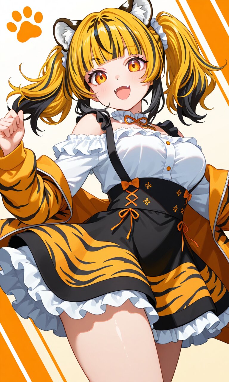 1girl, solo, multicolor hair, black hair, yellow hair, animal ears, tiger ears, medium hair, twintails, blunt bangs, medium breasts, orange eyes, tiger stripes, frills, off shoulder shirt, suspender skirt, open smile, dynamic pose
