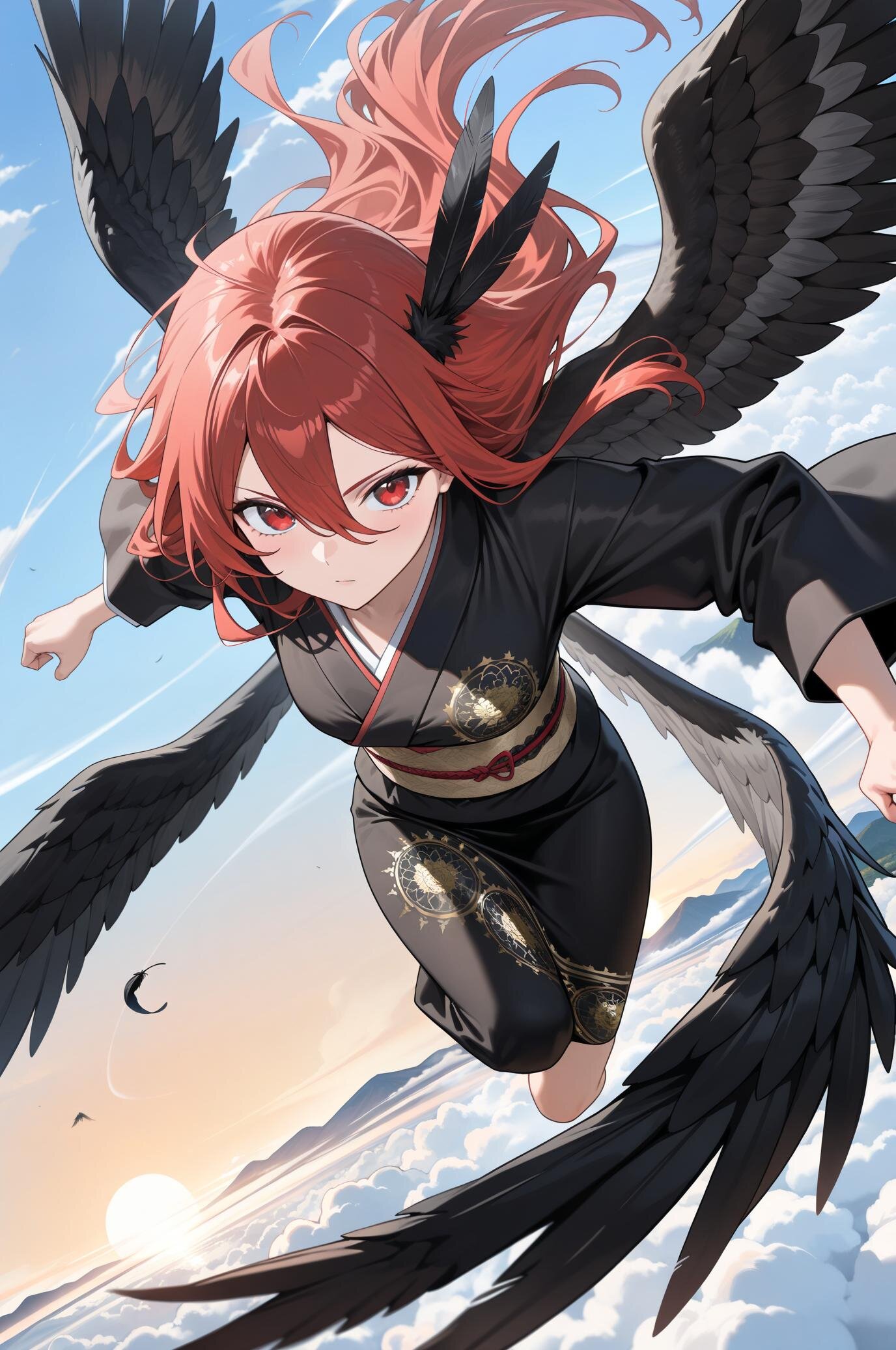 八咫烏は飾りの翼を紋章のまま背に浮かべ、身体だけを矢の角度に落とす。