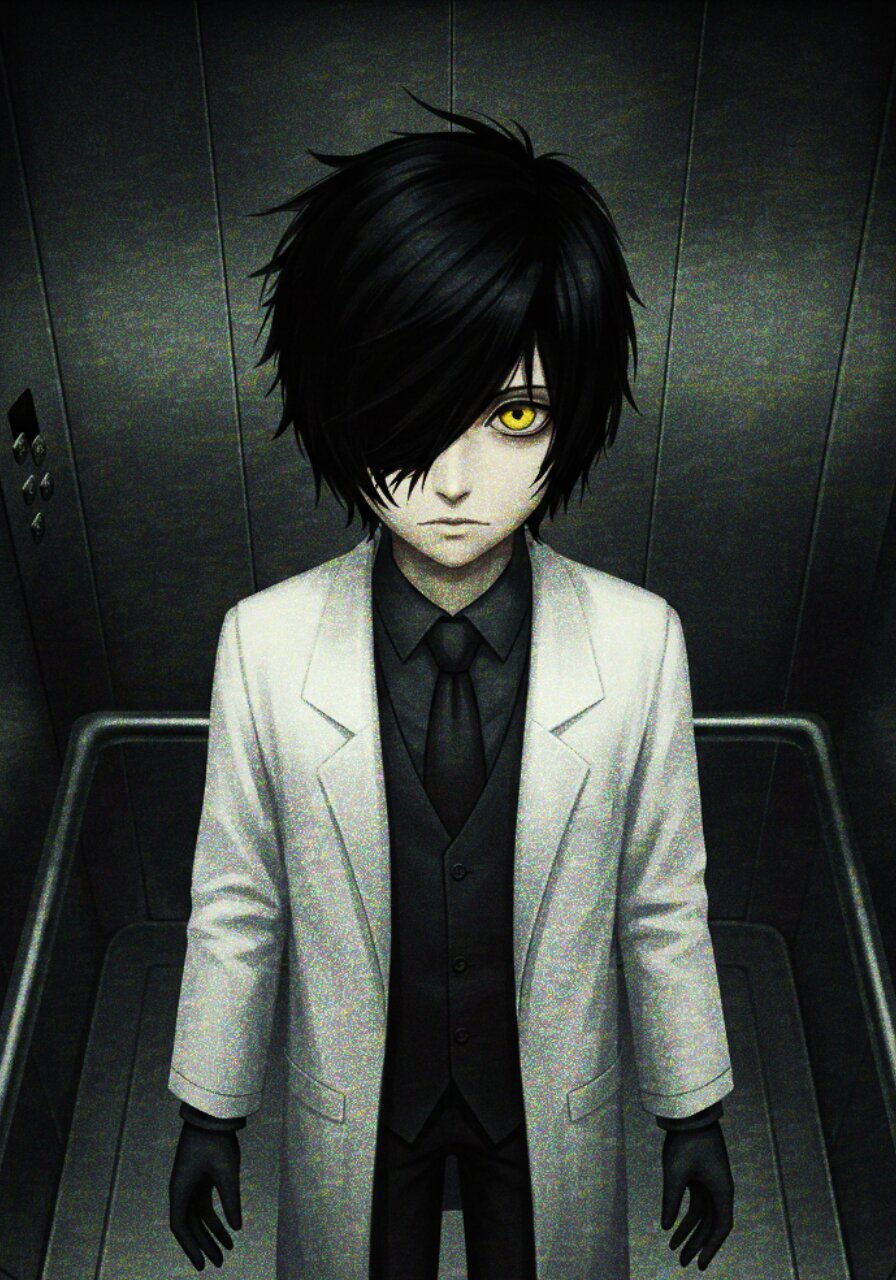 The defining and absolutely essential feature of this boy is his front bangs naturally covering one of his eyes, not an eyepatch, mask, or any accessory, and his hair is pure black. His hands are relaxed and not touching his hair. The most defining feature of this boy is his black hair, with the front bangs falling naturally to completely and unmistakably cover one of his yellow eyes. He has an expressionless, androgynous face with a distinctly aesthetic beauty, rendered in a semi-realistic, decadent style. He wears a pristine white lab coat over his black suit and black gloves. He is standing alone inside a vast, windowless elevator. The interior feels like a liminal space — sterile, unnaturally clean, and oppressively empty, yet with no clear purpose. The lighting is dim and uneven, casting unsettling shadows across the metallic walls, heightening the sense of claustrophobic darkness. The perspective is from a strong overhead angle, looking down at him, emphasizing his small, isolated presence within the vast, unnatural enclosure. The focus remains entirely on him, highlighting elegant detachment and a quietly haunting atmosphere.