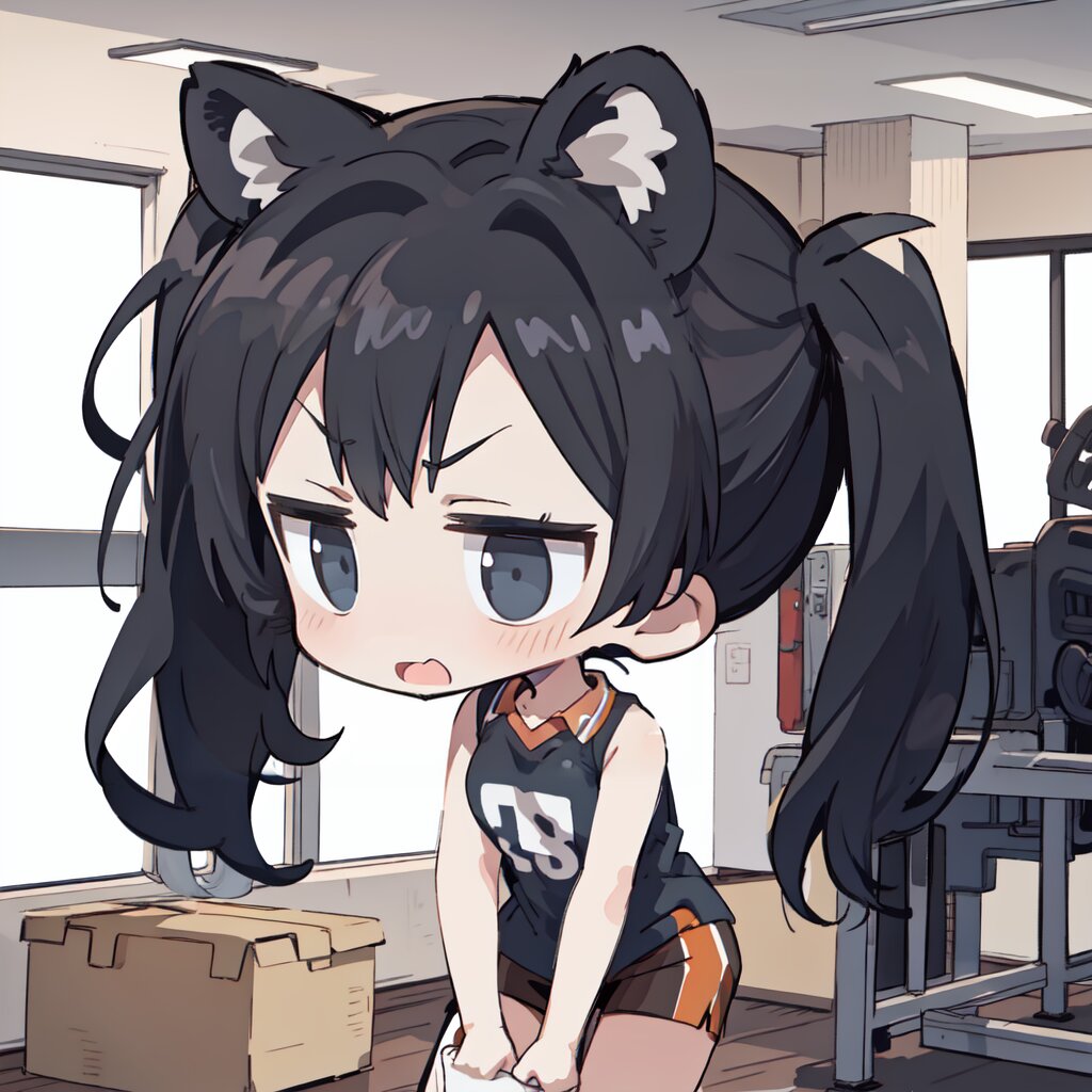 best quality, (empty eyes:-1.0),h4ikyuu, solo,1girl,(chibi:1.2),twintails,lion ears,black shirt,bare arms,serious,flying sweatdrops, indoors,gym, <lora:haikyuu-06:0.6>, <lora:fineline_v1:1.0>