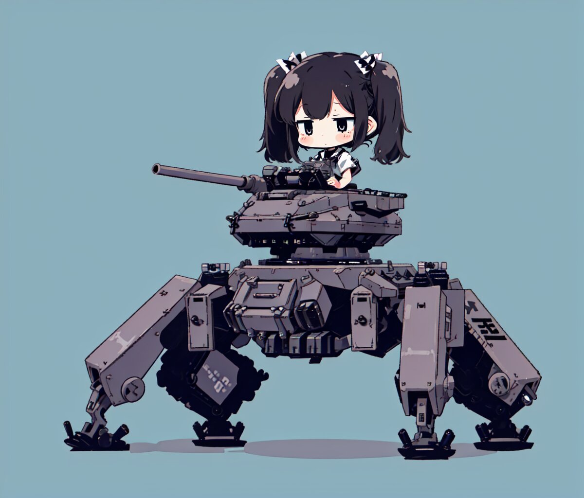 best quality, (mecha musume,cyborg,humanoid robot,exoskeleton,motorcycle:-1.0), (solo,1girl,chibi:1.2),cute,twintails,serious,(riding mecha \\\(flegs\\\),on mecha,hexapod:1.1),non-humanoid robot,military,tank,JSDF, (Indigo background:0.8), <lora:quadruped mechasV2:0.7:lbw=ALL:stop=10>, <lora:leco_spider_tank_v70c:-0.5>, <lora:leco_erase_riding_v10:0.4>, <lora:fineline_v1:1.0>