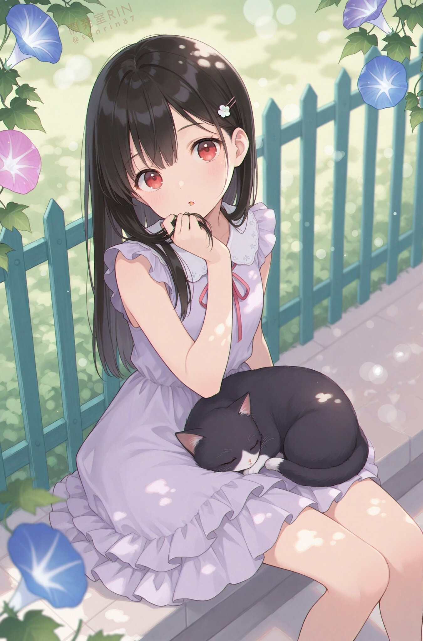 (flat color:0.1),(tareme:0.3), cute girl, sitting in shadow, leaf shadow, red eyes, straight hair ,black hair ,(hair between eyes:0.5), hairpin, kawaii, (pastel theme :0.5), (depth of field:1.2), (bokeh:0.9),:o,(excited:0.4) , head tilt, hand in hair, hand up, from above, (from side:0.1), BREAK sleeping cat , casual dress, fence with (morning glory:1.2), pink ribbon, chromatic aberration, (dappled sunlight:1.2), (cinematic lighting:0.4), (garden:1.2),light purple dress, layered skirt, sleeveless,red ribbon,sleeping cat on her lap, foreground flower, blurry foreground, blurry background, pastel hues, (tree:0.5)