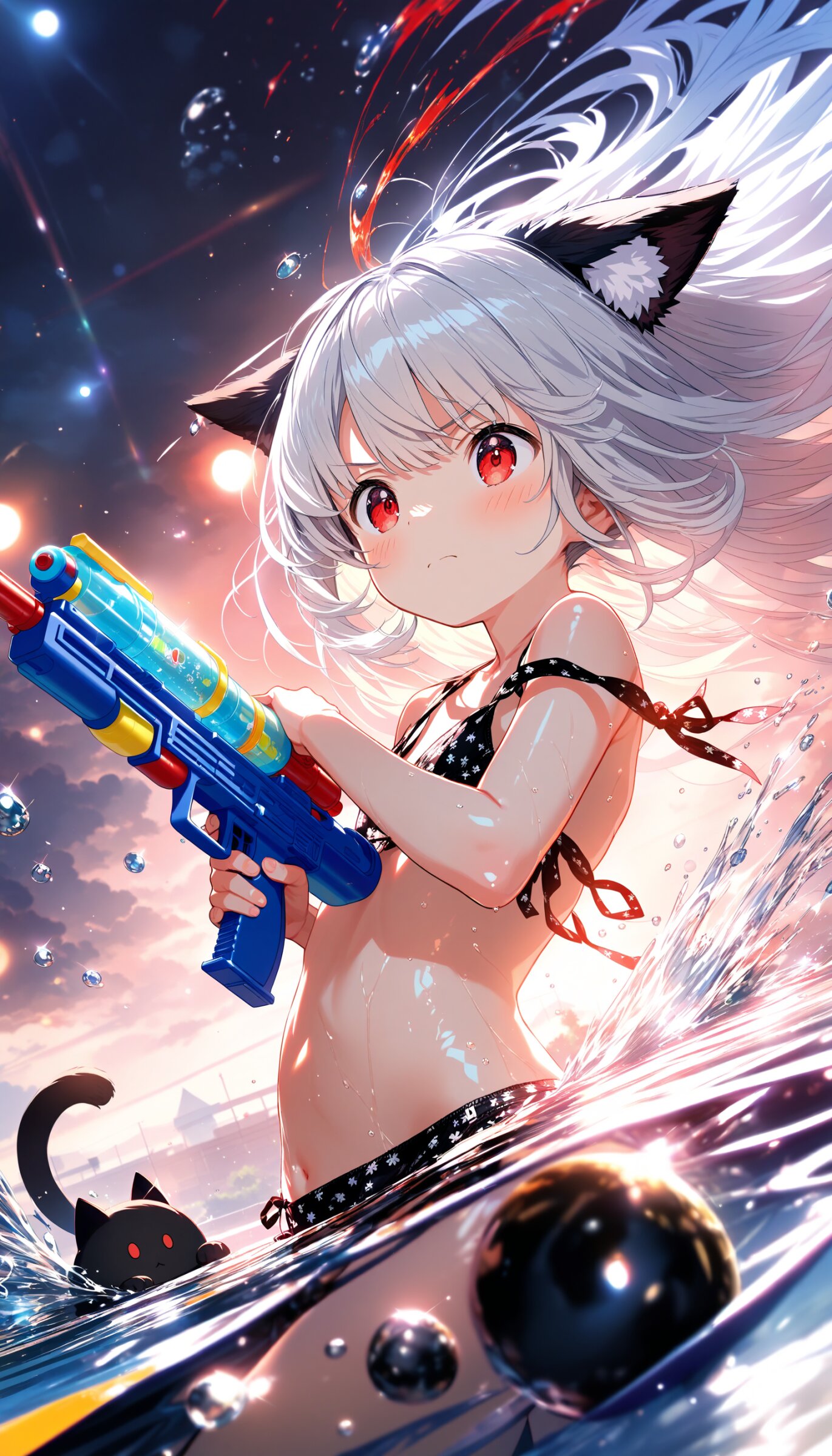 (masterpiece,high resolusion,illustration,ultra detailed 8k art,extremely detailed CG,official art,clothes reflecting light,detailed shiny skin,detailed background:1.3),(1 cute girl:1.3),(10yo),(child),loli,kawaii,platinum hair, long hair,red eyes,black cat girl,(black cat ears),(black cat tail),angry,bikini,((shooting water gun)),attack to girls,dynamic angle,((dynamic action)),pool side,summer,water game