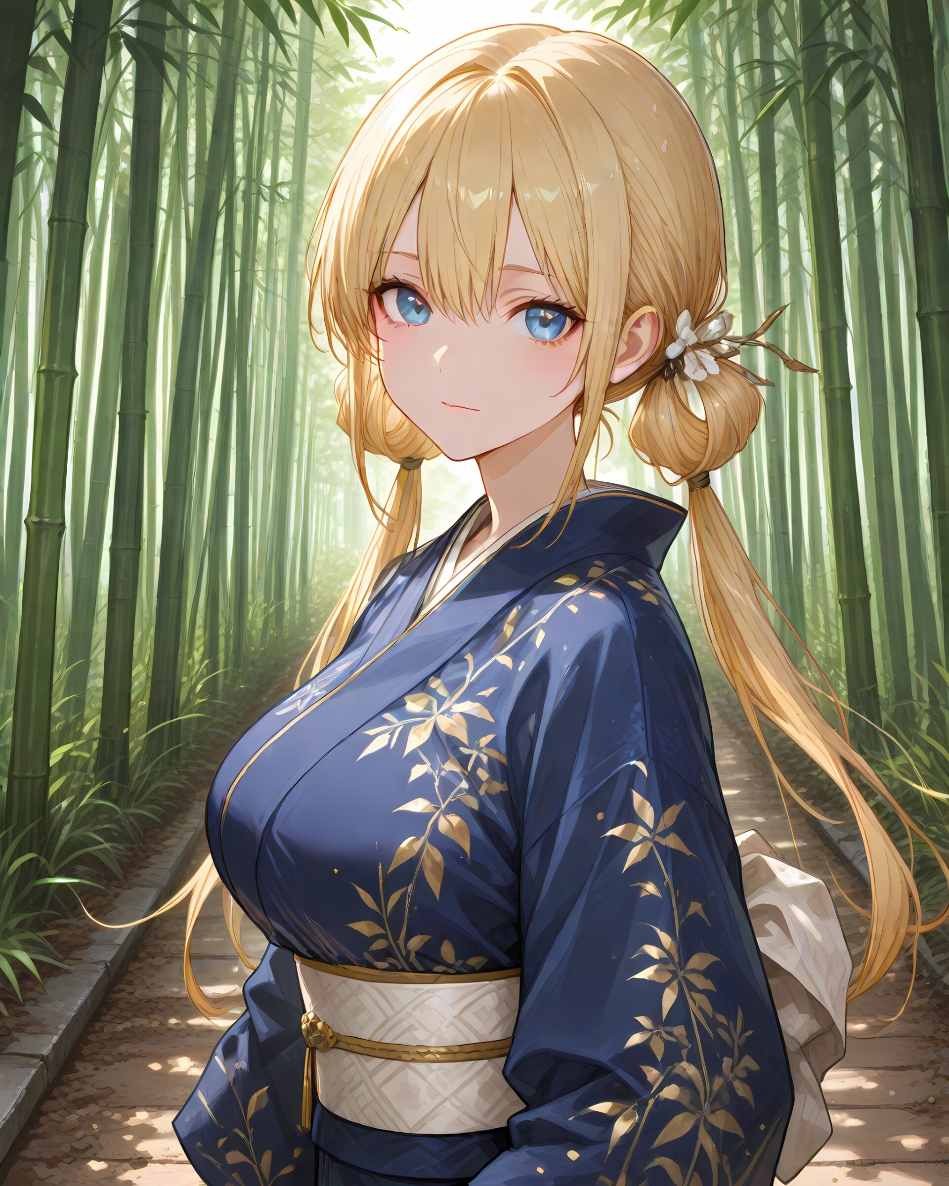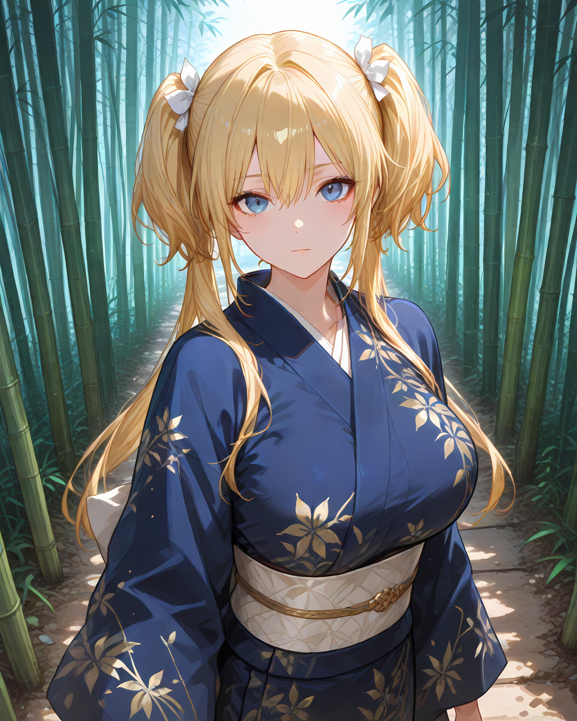 <lora:hyper_sdxl_8_step_lora_f16:1>,, 1girl, high twin tails, middle yellow hair, blue eyes, large breasts, dark color kimono, yukata, walking in bamboo grove, elegant pose, looking viewer, focus face, close-up, BREAK masterpiece, amazing quality, best quality, very aesthetic, ultra-detailed,