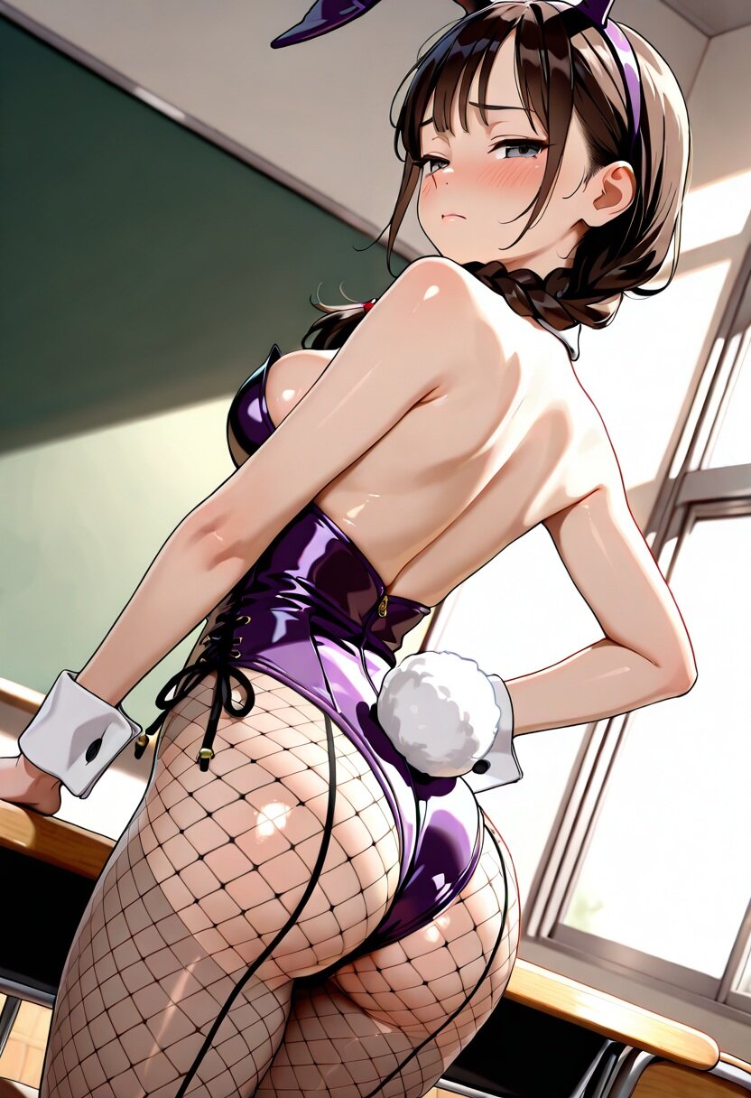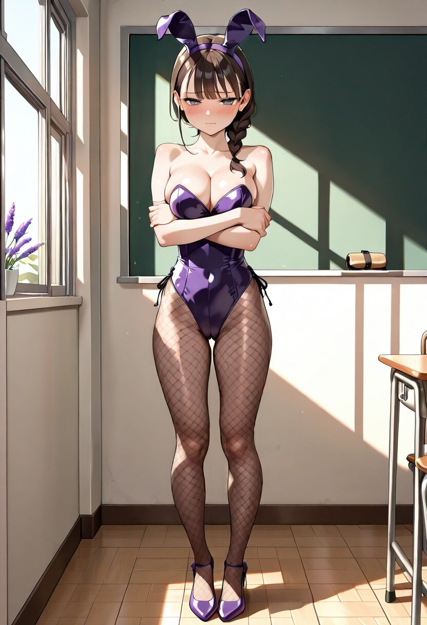 masterpiece,best quality,amazing quality, anime style,photorealistic, shiny skin, indoors, classroom, cowboy shot, dutch angle, BREAK 1girl,(teen girl), cute,petite,single braid, wispy bangs,brown hair, gray eyes, (detailed eyes, clear eyes1.3),half closed eyes, tsurime, large breasts, shy, embarrassed, seductive smile,looking at viewer,(dynamic pose:1.45), BREAK ((playboy bunny)), lavender clothes,black fishnet tights, lavender high heels , <lora:illustrious_quality_modifiers_masterpieces_v1:1>