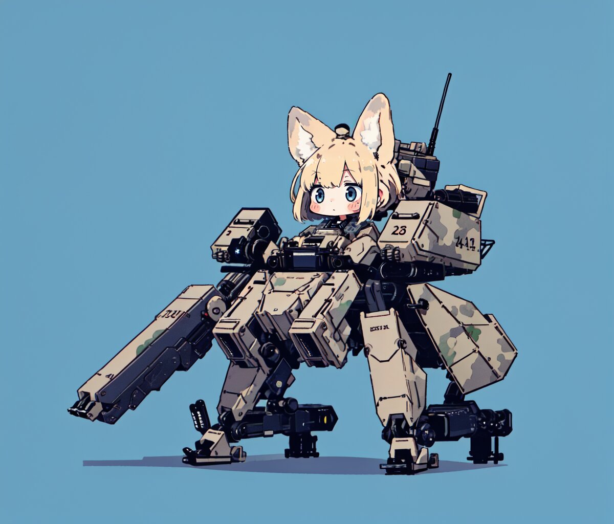 best quality, (mecha musume,cyborg,humanoid robot,exoskeleton,motorcycle:-1.0), (solo,1girl,chibi:1.2),cute,fennec ears,jitome,(maneuvering mecha \\\(flegs\\\),on mecha,hexapod:1.1),non-humanoid robot,military,japan self-defense force,camouflage, (Slate blue background:0.8), <lora:quadruped mechasV2:0.7:lbw=ALL:stop=10>, <lora:leco_spider_tank_v70c:-0.5:lbw=ALL:stop=10>, <lora:fineline_v1:1.0>