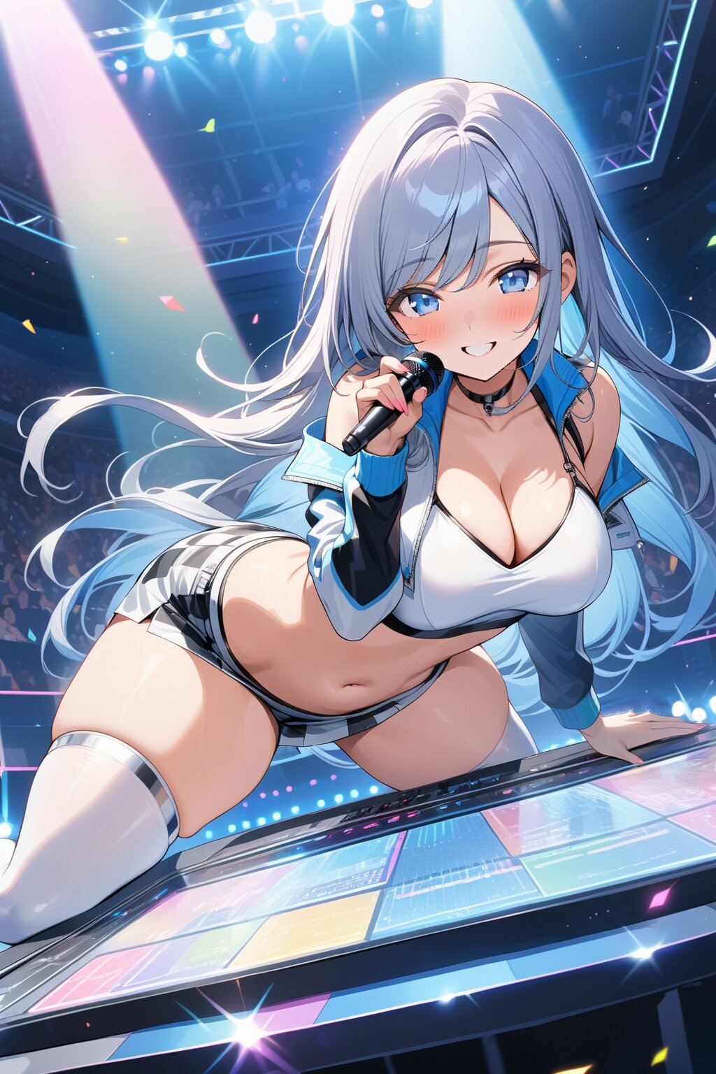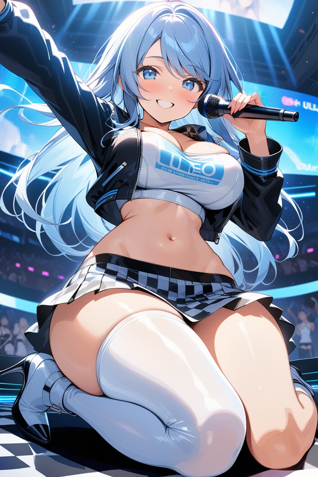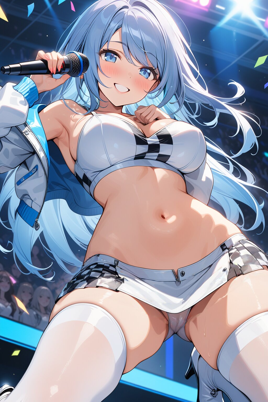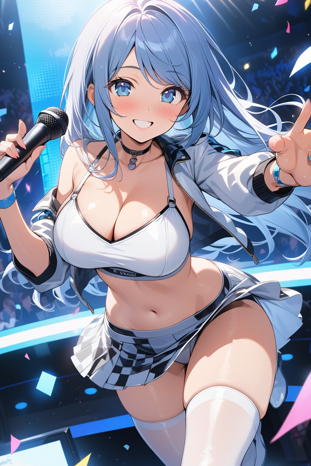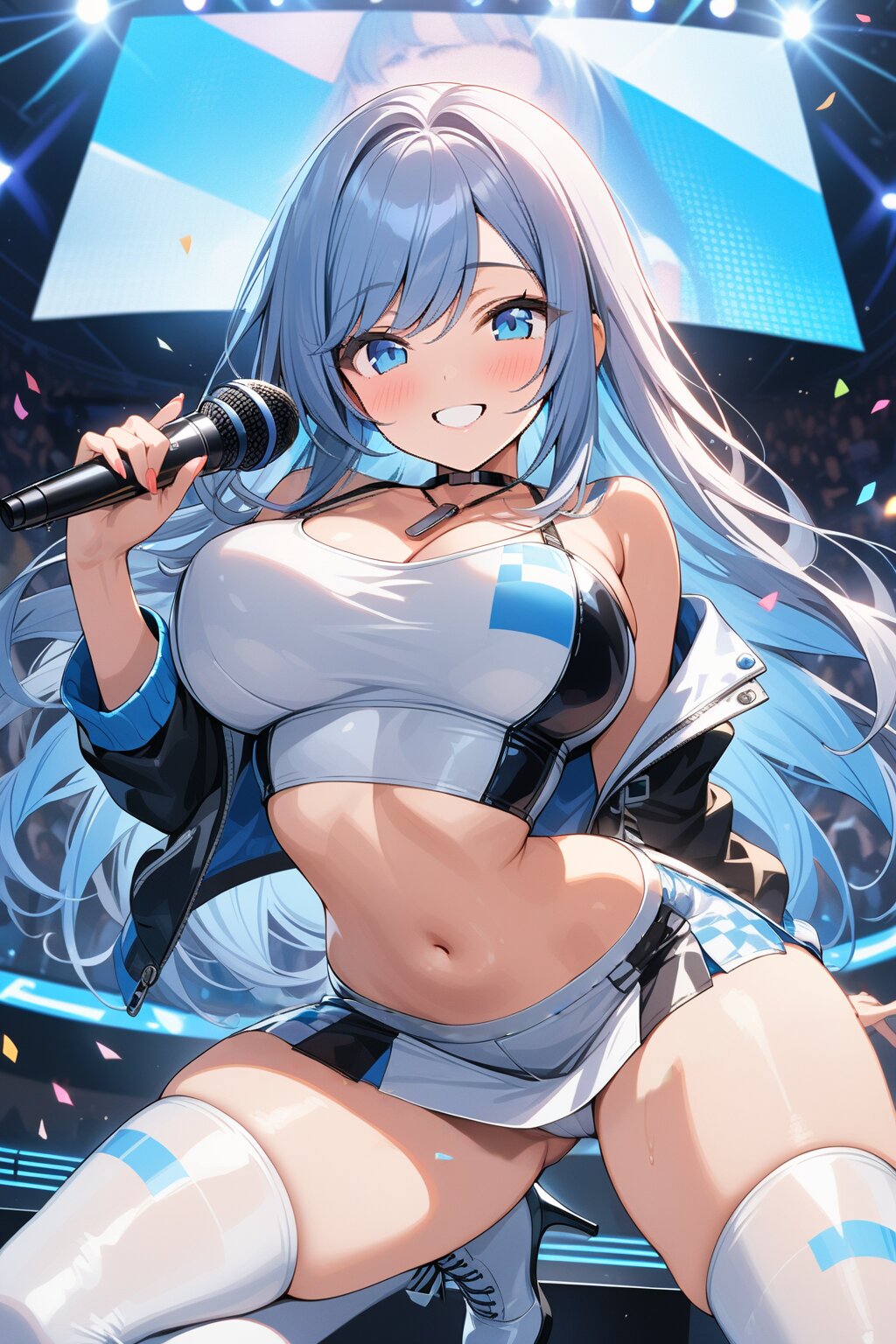 ((8k, masterpiece ,best quality ,ultra-detailed)), game cg, masterpiece, (perfect face:1.1025), (perfect hands:1.1025), (perfect legs:1.1025), (perfect arms:1.1025), (perfect fingers:1.1025), 1girl, solo, (singing:1.3), (holding microphone:1.3), front view, dynamic angle, from below, on the stage, holographic monitor, screen light, confetti, (crowd:1.2), speaker, stage lights, spotlight, beautiful lighting, (light grey long hair:1.4), (straight long hair:1.4), (swept bangs:1.3), BREAK (blue eyes:1.4), japanese_girl, (large breasts:1.2), (gleaming skin:1.4), (smile:1.3), blush, BREAK (sexy pit-girl costume:1.3), (wear a white latex midriff jacket over a checkered flag pattern print crop top with plunking neckline:1.4), (white and black checkered flag print on crop top:1.4), ((collarbone, stomach):1.2), (white latex ultra low-rise miniskirt:1.4), (fusion of white latex thigh-high tights and silver thigh-high boots with heels:1.3), <lora:xl_more_art-full_v1:0.6>,