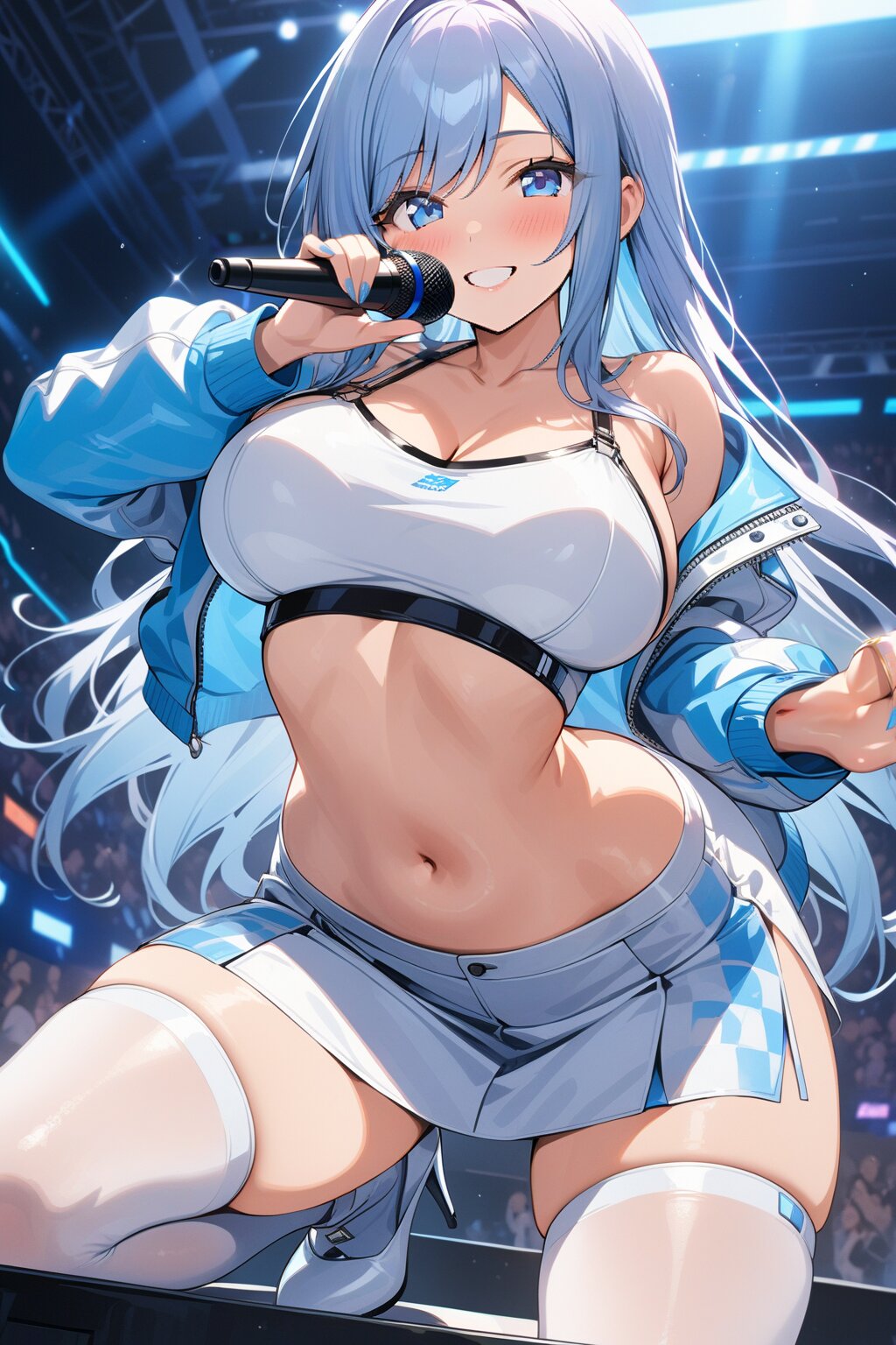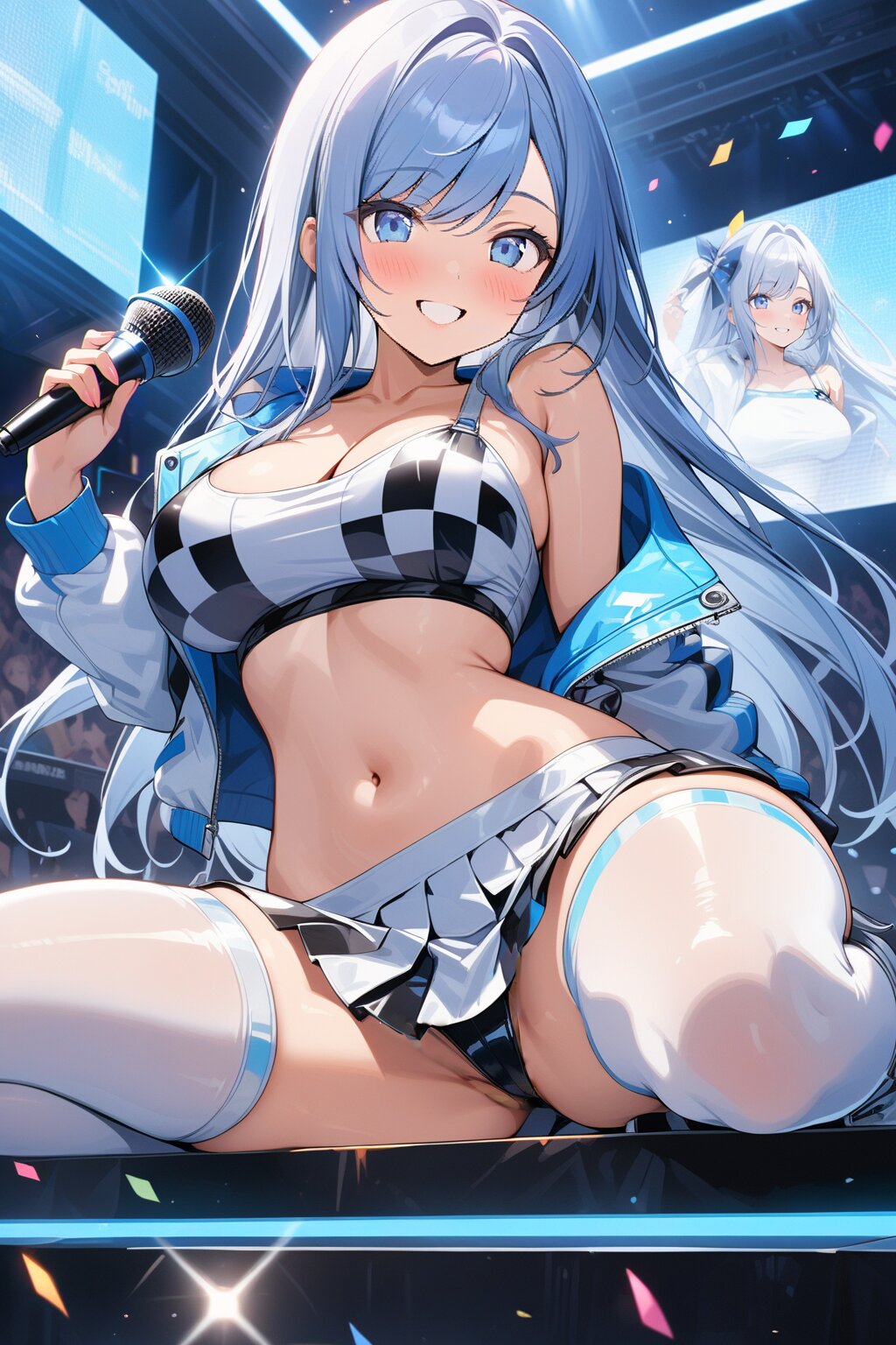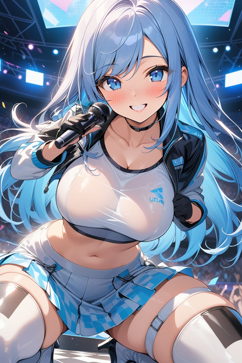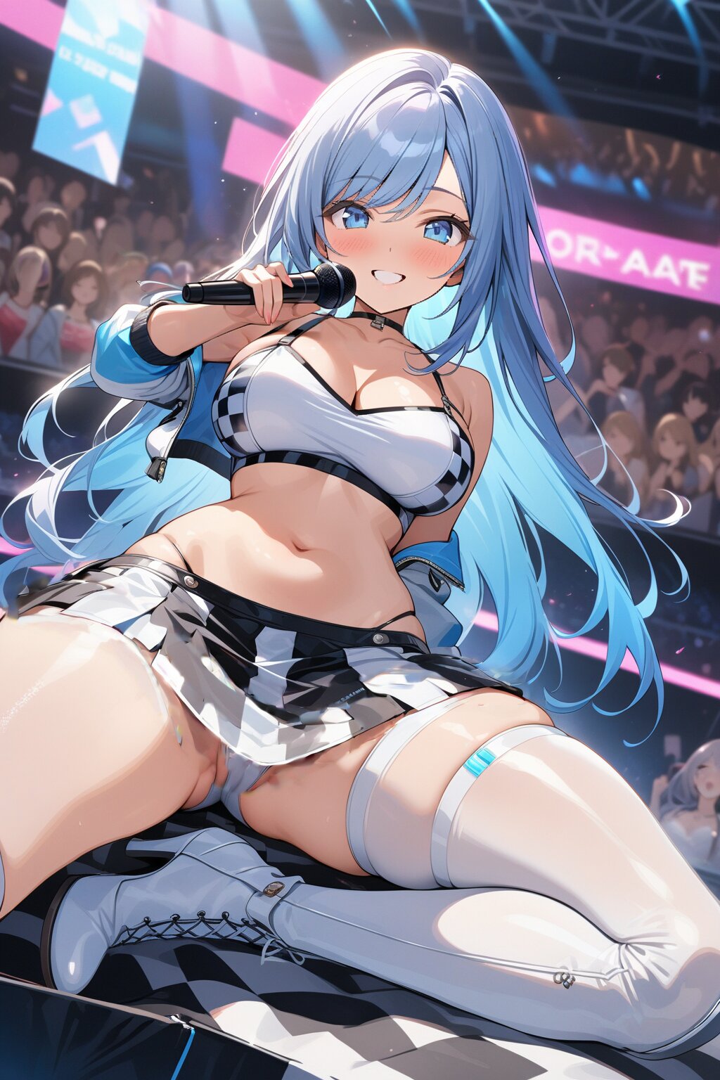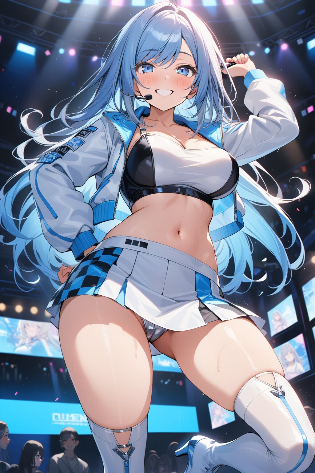((8k, masterpiece ,best quality ,ultra-detailed)), game cg, masterpiece, (perfect face:1.1025), (perfect hands:1.1025), (perfect legs:1.1025), (perfect arms:1.1025), (perfect fingers:1.1025), 1girl, solo, (singing:1.3), (holding microphone:1.3), front view, dynamic angle, from below, on the stage, holographic monitor, screen light, confetti, (crowd:1.2), speaker, stage lights, spotlight, beautiful lighting, (light grey long hair:1.4), (straight long hair:1.4), (swept bangs:1.3), BREAK (blue eyes:1.4), japanese_girl, (large breasts:1.2), (gleaming skin:1.4), (smile:1.3), blush, BREAK (sexy pit-girl costume:1.3), (wear a white latex midriff jacket over a checkered flag pattern print crop top with plunking neckline:1.4), (white and black checkered flag print on crop top:1.4), ((collarbone, stomach):1.2), (white latex ultra low-rise miniskirt:1.4), (fusion of white latex thigh-high tights and silver thigh-high boots with heels:1.3), <lora:xl_more_art-full_v1:0.6>,