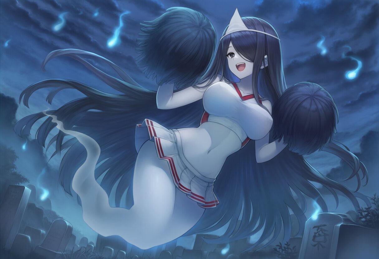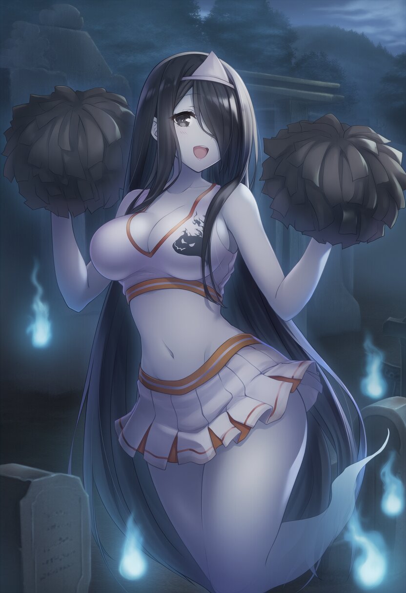 {{{highly detailed}}}, {{official style}}, {{game cg}}, {{intricate}}, {{{detailed beautiful eyes, detailed beautiful face, detailed beautiful face and eyes}}}, 1girl, solo, {{tenka hyakken}}, {{25 year old women}}, {{adult women}}, {{slender}}, {{horror (theme)}}, black eyes, {{{tsurime}}}, long hair, black hair, {{{straight hair}}}, hair over one eye, {{white skin}}, large breasts, {{happy}}, navel, {{cheerleader}}, {{wearing white cheerleader costume, skirt}}, {{{holding a black pompon}}}, {{ghost tail, triangular headpiece}}, night sky, {{graveyard, ghost, japanese style}}, {{dark, horror, human soul}}, night, outdoors, {{{masterpiece}}}, {{{best quality}}}, {{ultra-detailed}}, {illustration}, {{an extremely delicate and beautiful}}