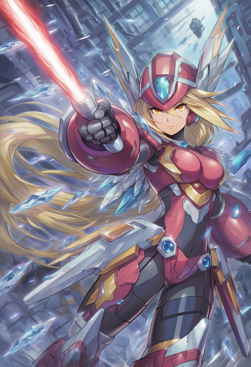 {{{highly detailed}}}, {{official style}}, {{game cg}}, {{intricate}}, {{{detailed beautiful eyes, detailed beautiful face, detailed beautiful face and eyes}}}, 1girl, solo, {{mega man (series)}}, {{android, robot girl}}, red helmet, yellow eyes, very long hair, low ponytail, yellow hair, hair between eyes, large breasts, blue crystal, red armor, {{{{{{battle, holding lightsaber}}}}}}, serious, cowboy shot, standing, cyberpunk, futuristic city, {{{masterpiece}}}, {{{best quality}}}, {{ultra-detailed}}, {illustration}, {{an extremely delicate and beautiful}}